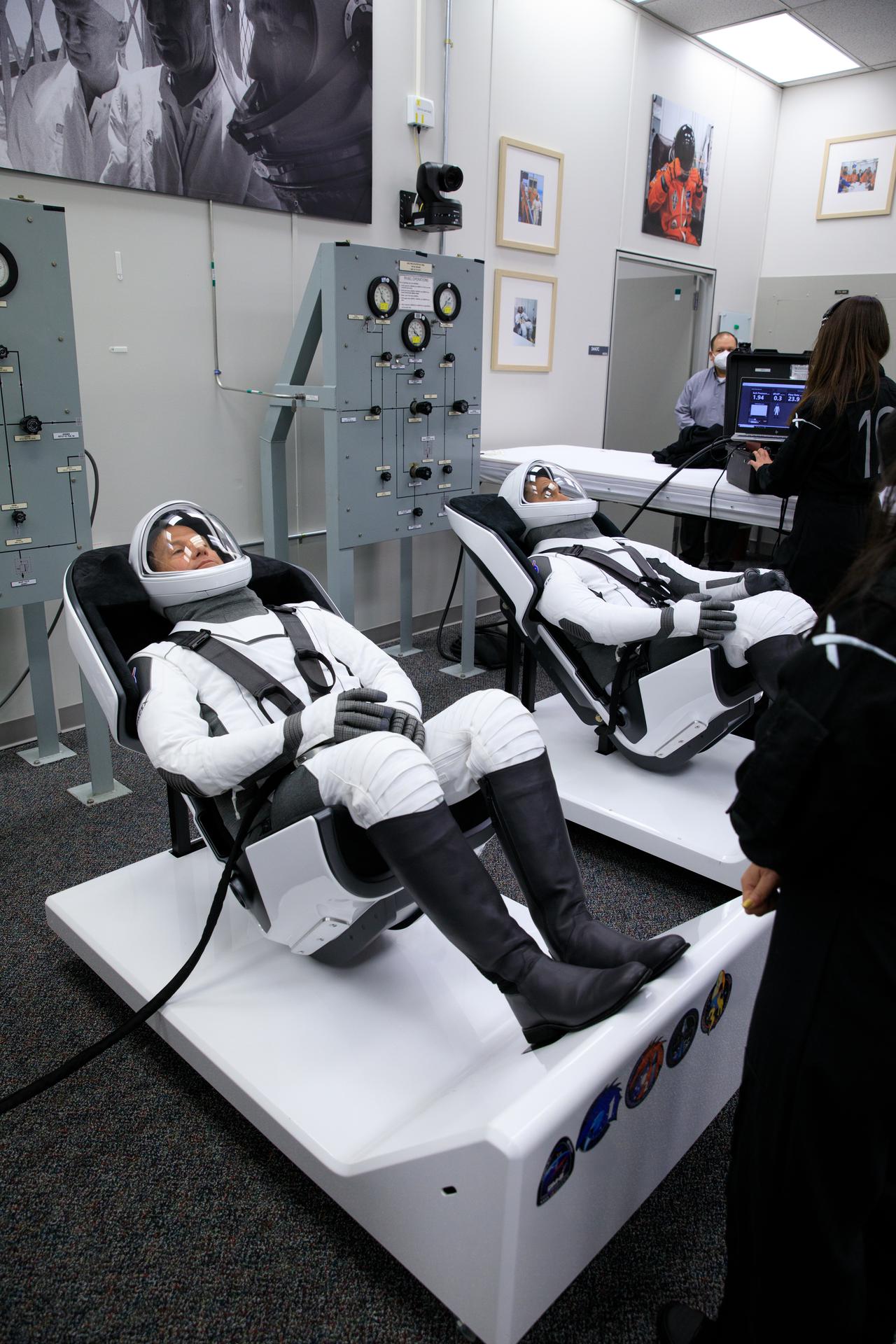 NASA SpaceX Crew-3 mission astronauts are in the suit-up room in the Astronaut Crew Quarters inside Kennedy Space Center’s Neil A. Armstrong Operations and Checkout Building on launch day, Nov. 10, 2021. A team of SpaceX suit technicians will help them as they put on their custom-fitted spacesuits and check the suits for leaks. In view, from left are NASA astronauts Tom Marshburn, pilot; and Raja Chari, commander. The Falcon 9 rocket with Crew Dragon Endurance will launch the four-person crew to the International Space Station for NASA’s Commercial Crew Program. Crew-3 is scheduled to launch at 9:03 p.m. EST from Launch Complex 39A at Kennedy.