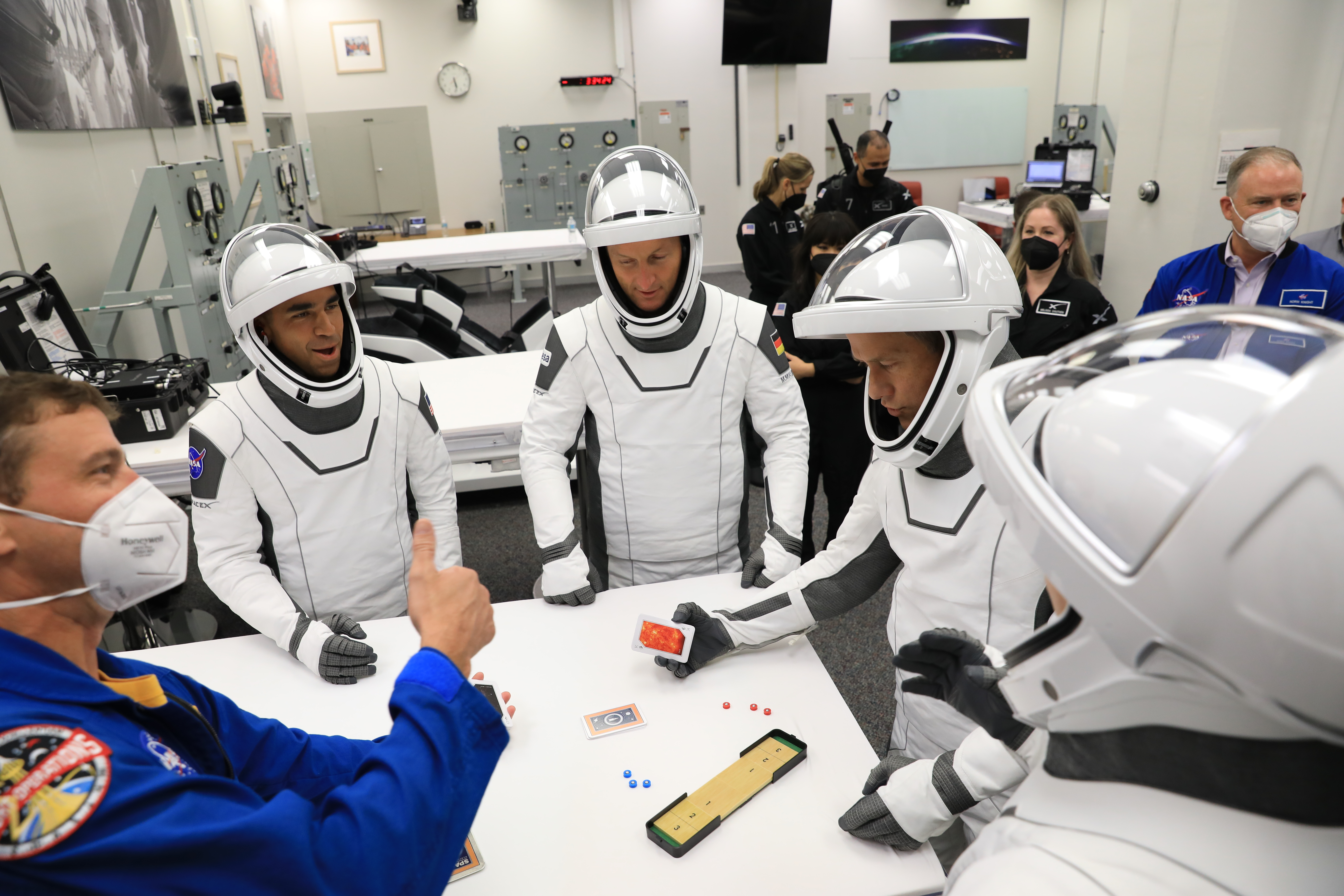 NASA SpaceX Crew-3 mission astronauts play a game while inside the suit-up room in the Astronaut Crew Quarters at Kennedy Space Center’s Neil A. Armstrong Operations and Checkout Building on launch day, Nov. 10, 2021. The Falcon 9 rocket with Crew Dragon Endurance will launch Crew-3 astronauts Raja Chari, Thomas Marshburn, Kayla Barron and Matthias Maurer to the International Space Station for NASA’s Commercial Crew Program. Crew-3 is scheduled to launch at 9:03 p.m. EST from Launch Complex 39A at Kennedy.