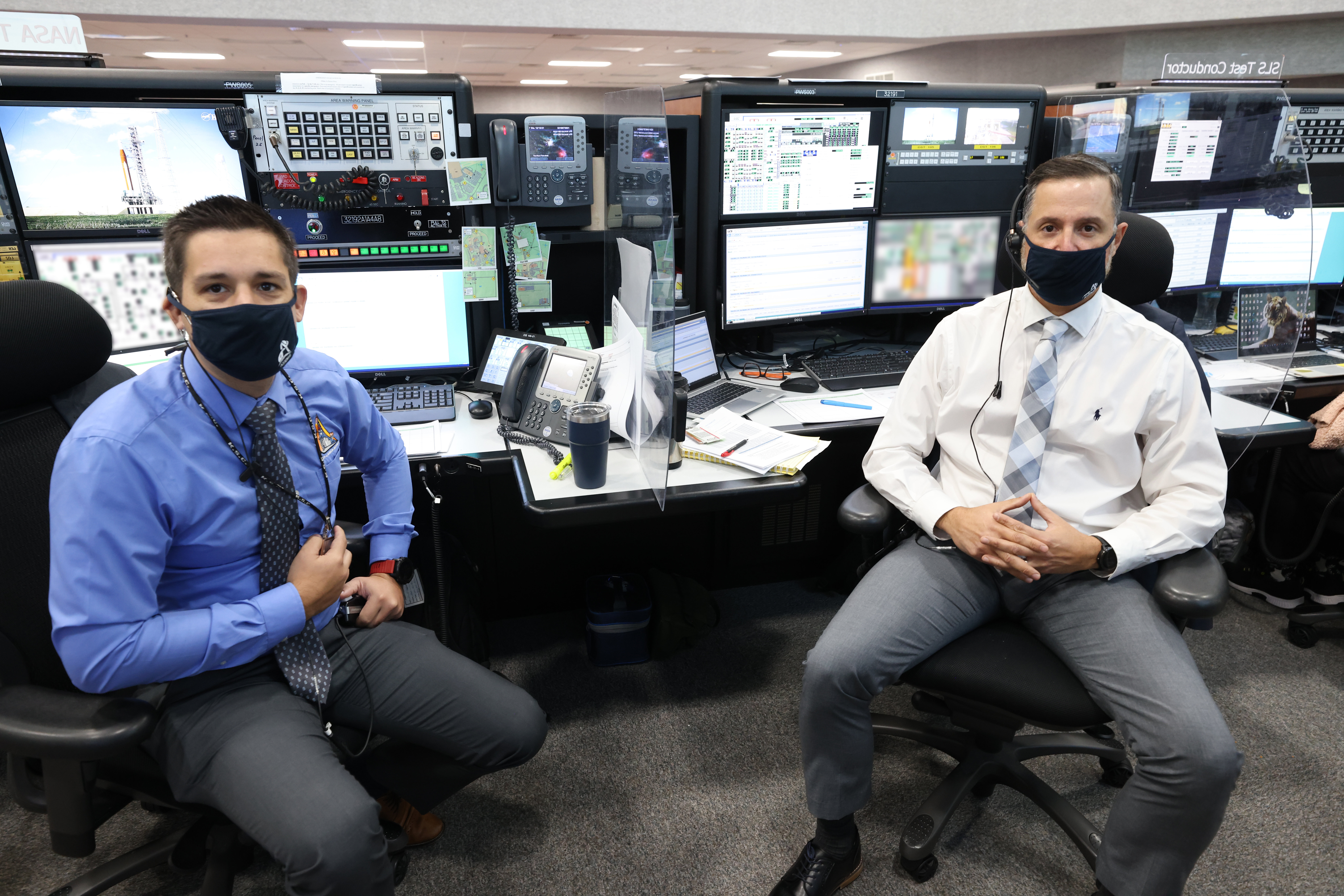 NASA Test Directors Daniel Florez, left, and Carlos Monje, right, with Exploration Ground Systems, are seated at their consoles inside Firing Room 1 of the Launch Control Center at NASA’s Kennedy Space Center in Florida on Dec. 13, 2021. They are participating in a joint integrated simulation for the Artemis I launch that covered both cryogenic loading and terminal countdown portions of prelaunch activities. Members of NASA’s mission management team and launch team conducted the simulation together. The Kennedy team was certified for the Artemis I launch. During Artemis I, the agency’s Orion spacecraft will lift off from Kennedy aboard NASA’s most powerful rocket – the Space Launch System – to fly farther than any spacecraft built for humans has ever flown. Through NASA’s Artemis missions, the agency, along with commercial and international partners, will establish a sustainable human presence on the Moon to prepare for missions to Mars.