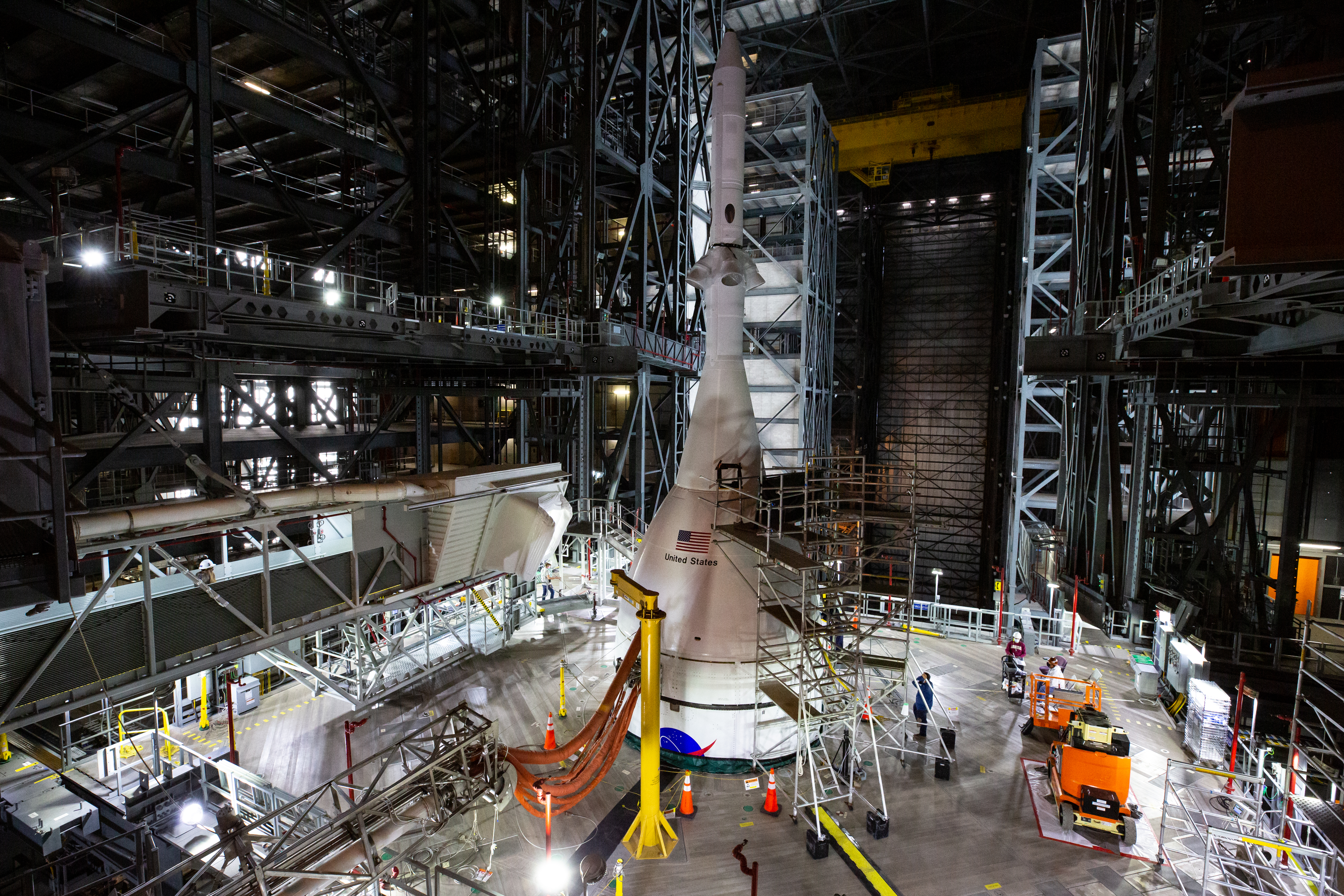 In view high up in High Bay 3 of the Vehicle Assembly Building at NASA’s Kennedy Space Center in Florida, is the Artemis I Orion spacecraft enclosed in its launch abort system atop the Space Launch System on Jan 10, 2022. A work platform has been extended around Orion. Artemis I will be the first integrated test of NASA’s deep space exploration systems: the Orion spacecraft, Space Launch System (SLS) rocket and the ground systems at Kennedy. In later missions, NASA will land the first woman and the first person of color on the surface of the Moon, paving the way for a long-term lunar presence and serving as a steppingstone on the way to Mars.