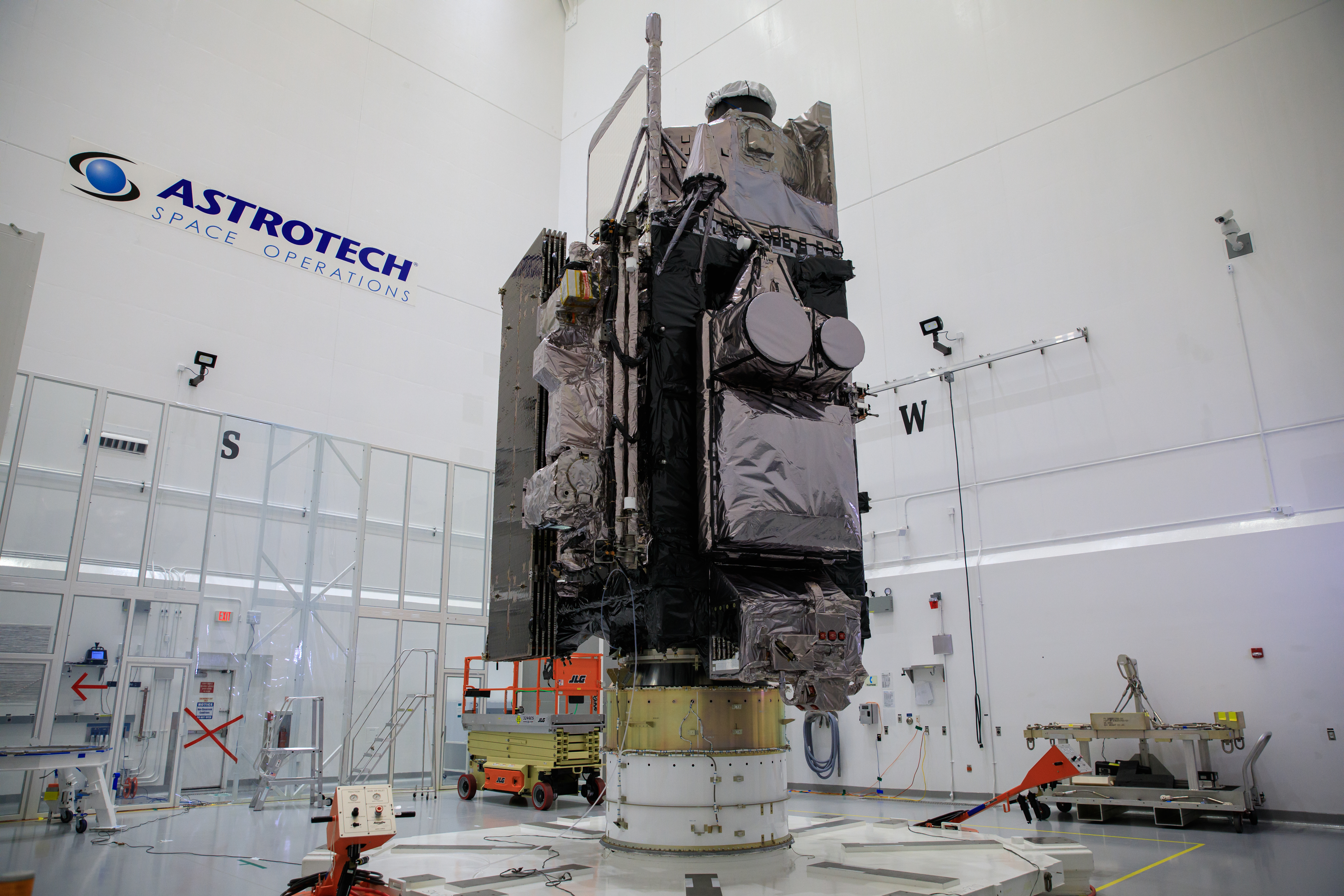 NOAA’s Geostationary Operational Environmental Satellite-T (GOES-T) is secured on a work stand inside the Astrotech Space Operations facility in Titusville, Florida, on Jan. 28, 2022, as it is being prepared for encapsulation. GOES-T is scheduled to launch on March 1, 2022, atop a United Launch Alliance (ULA) Atlas V 541 rocket from Space Launch Complex 41 at Cape Canaveral Space Force Station. GOES-T is the third satellite in the GOES-R series that will continue to help meteorologists observe and predict local weather events that affect public safety. The launch is being managed by NASA’s Launch Services Program based at Kennedy Space Center in Florida, America’s multi-user spaceport.