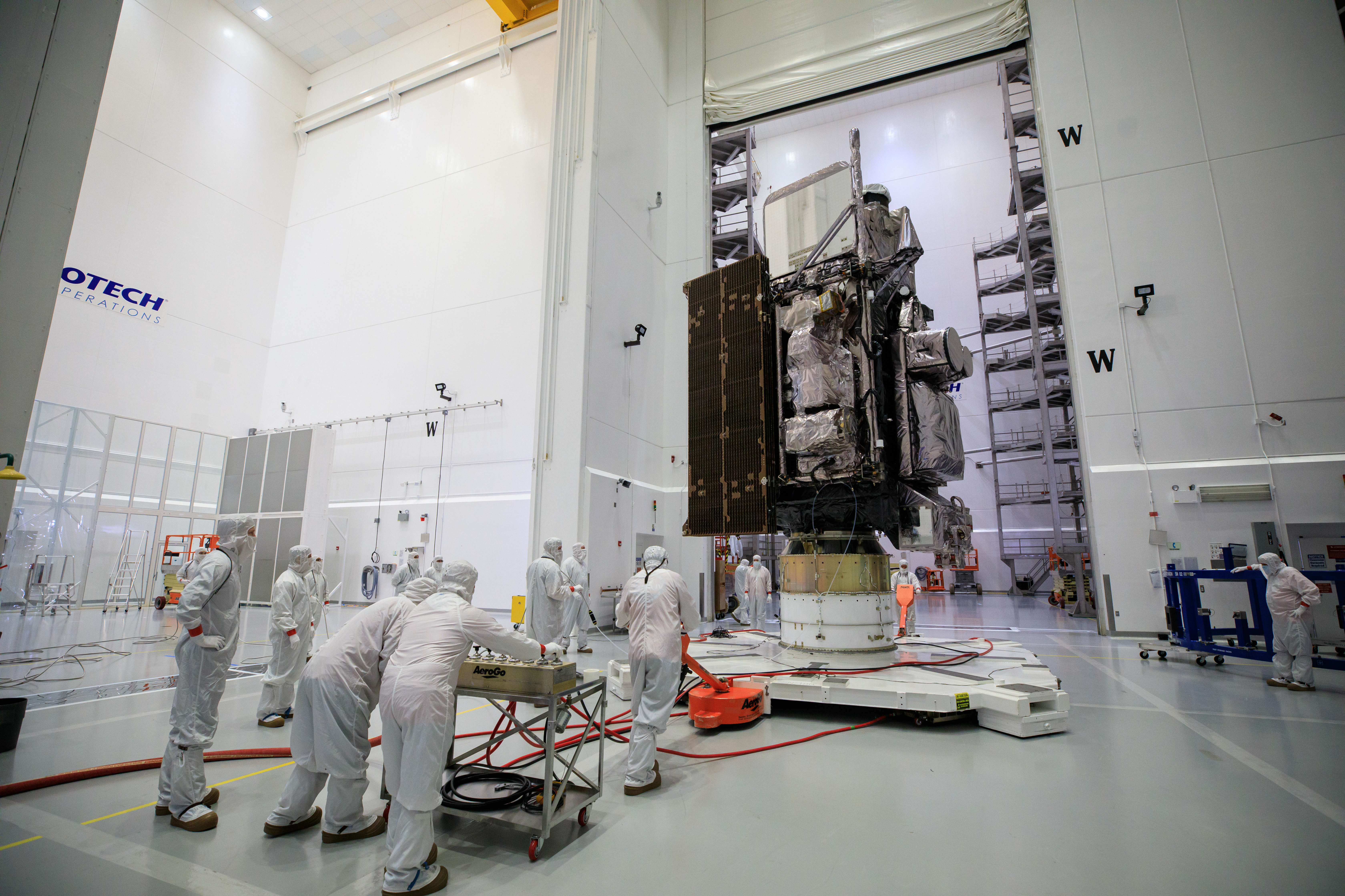 Technicians move NOAA’s Geostationary Operational Environmental Satellite-T (GOES-T) inside the Astrotech Space Operations facility in Titusville, Florida, on Jan. 28, 2022. The spacecraft is being prepared for encapsulation inside its protective payload fairings. GOES-T is scheduled to launch on March 1, 2022, atop a United Launch Alliance (ULA) Atlas V 541 rocket from Space Launch Complex 41 at Cape Canaveral Space Force Station. GOES-T is the third satellite in the GOES-R series that will continue to help meteorologists observe and predict local weather events that affect public safety. The launch is being managed by NASA’s Launch Services Program based at Kennedy Space Center in Florida, America’s multi-user spaceport.