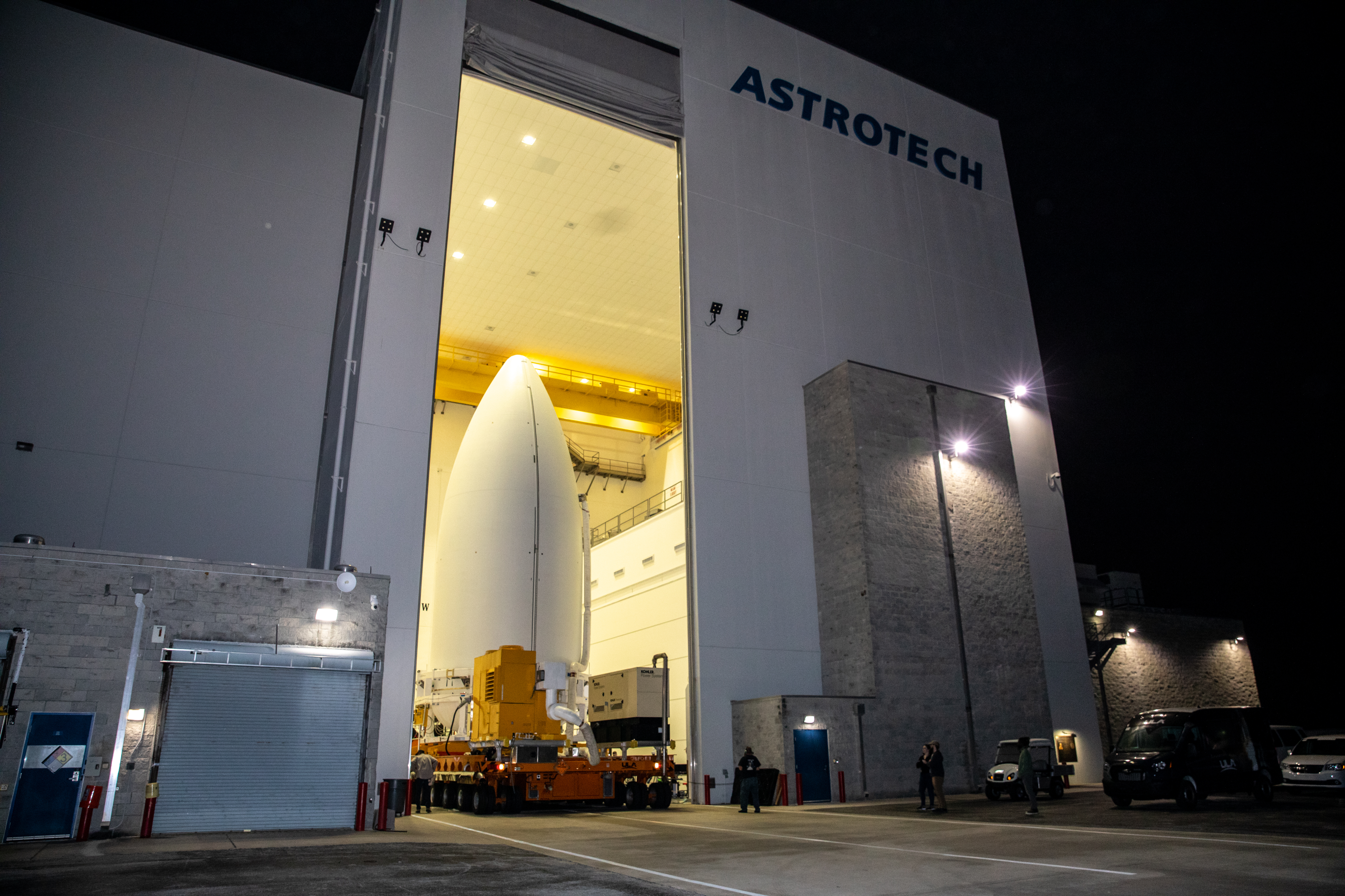 The National Oceanic and Atmospheric Administration’s (NOAA) Geostationary Operational Environmental Satellite-T (GOES-T), enclosed in its payload fairing, begins its move out of the Astrotech Space Operations facility in Titusville, Florida, for the trip to the Vertical Integration Facility at Space Launch Complex 41 at Cape Canaveral Space Force Station in Florida on Feb. 17, 2022. The satellite will be lifted up inside the integration facility and secured to the United Launch Alliance Atlas V 541 rocket. GOES-T is scheduled to launch atop the Atlas V rocket from SLC-41 on March 1, 2022, at 4:38 p.m. GOES-T is the third satellite in the GOES-R series that will continue to help meteorologists observe and predict local weather events that affect public safety. The launch is being managed by NASA’s Launch Services Program based at Kennedy Space Center in Florida, America’s multi-user spaceport.
