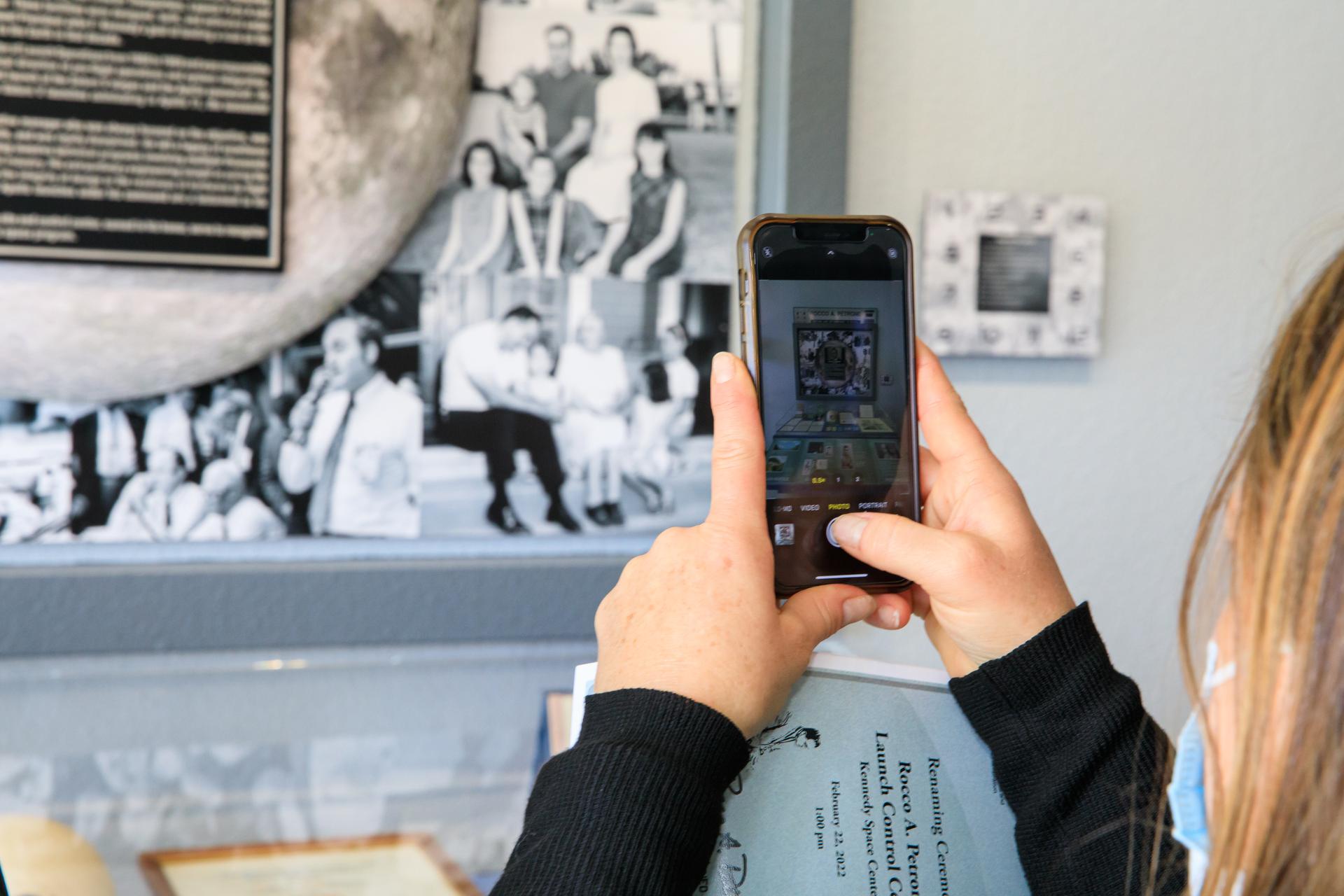 A spectator takes a photo of a display dedicated to former Kennedy Space Center director Rocco Petrone on Feb. 22, 2022. During a ceremony held at the Florida spaceport, Kennedy’s launch control center was officially renamed to the Rocco A. Petrone Launch Control Center. Petrone was instrumental in America’s first voyages to the Moon and headed the Apollo program. He died in 2006 at the age of 80.