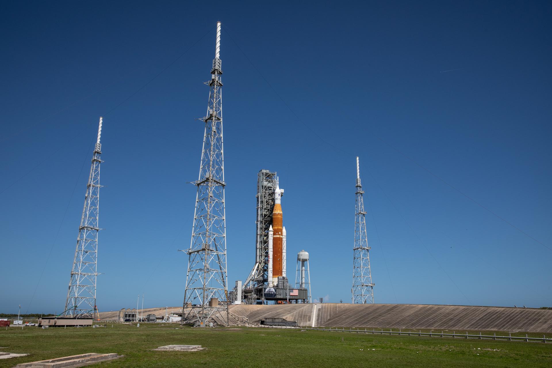Standing atop the mobile launcher, NASA’s Space Launch System (SLS) rocket and Orion spacecraft can be seen at Launch Pad 39B at the agency’s Kennedy Space Center in Florida on March 18, 2022. The Artemis I stack was carried from the Vehicle Assembly Building to the pad – a 4.2-mile journey that took nearly 11 hours to complete – by the agency’s crawler-transporter 2 for a wet dress rehearsal ahead of the uncrewed launch. Artemis I will test SLS and Orion as an integrated system prior to crewed flights to the Moon. Through Artemis, NASA will land the first woman and the first person of color on the lunar surface, paving the way for a long-term lunar presence and serving as a steppingstone on the way to Mars.