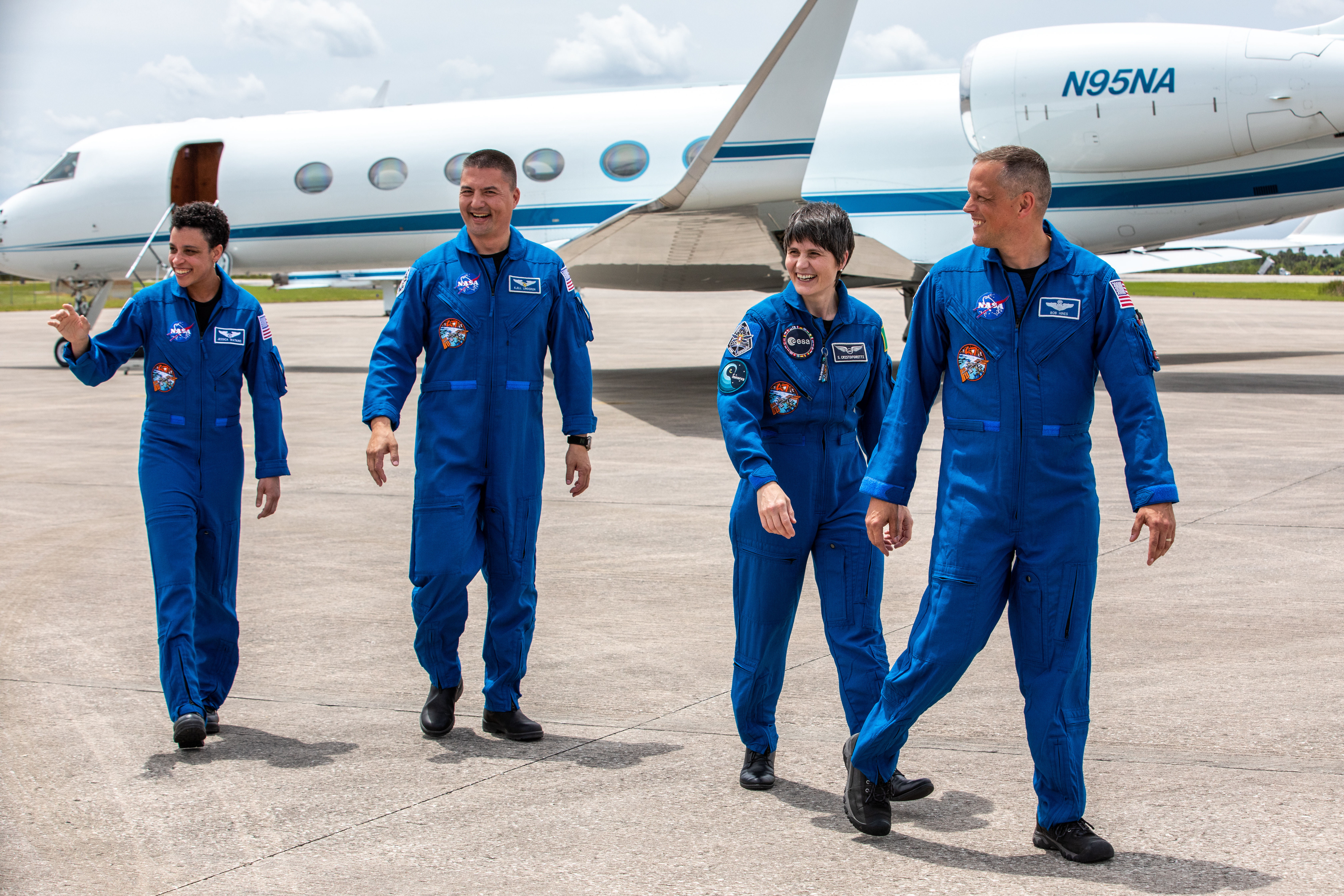 SpaceX Crew-4 astronauts arrive at the Launch and Landing Facility at Kennedy Space Center in Florida on April 18, 2022. From left are Jessica Watkins, Kjell Lindgren, ESA (European Space Agency) astronaut Samantha Cristoforetti, and Bob Hines. The astronauts will enter quarantine at the center’s astronaut crew quarters, as they await launch aboard the Crew Dragon on a SpaceX Falcon 9 rocket. Launch is targeted for 5:26 a.m. EDT on April 23, 2022, from Kennedy’s Launch Complex 39A.