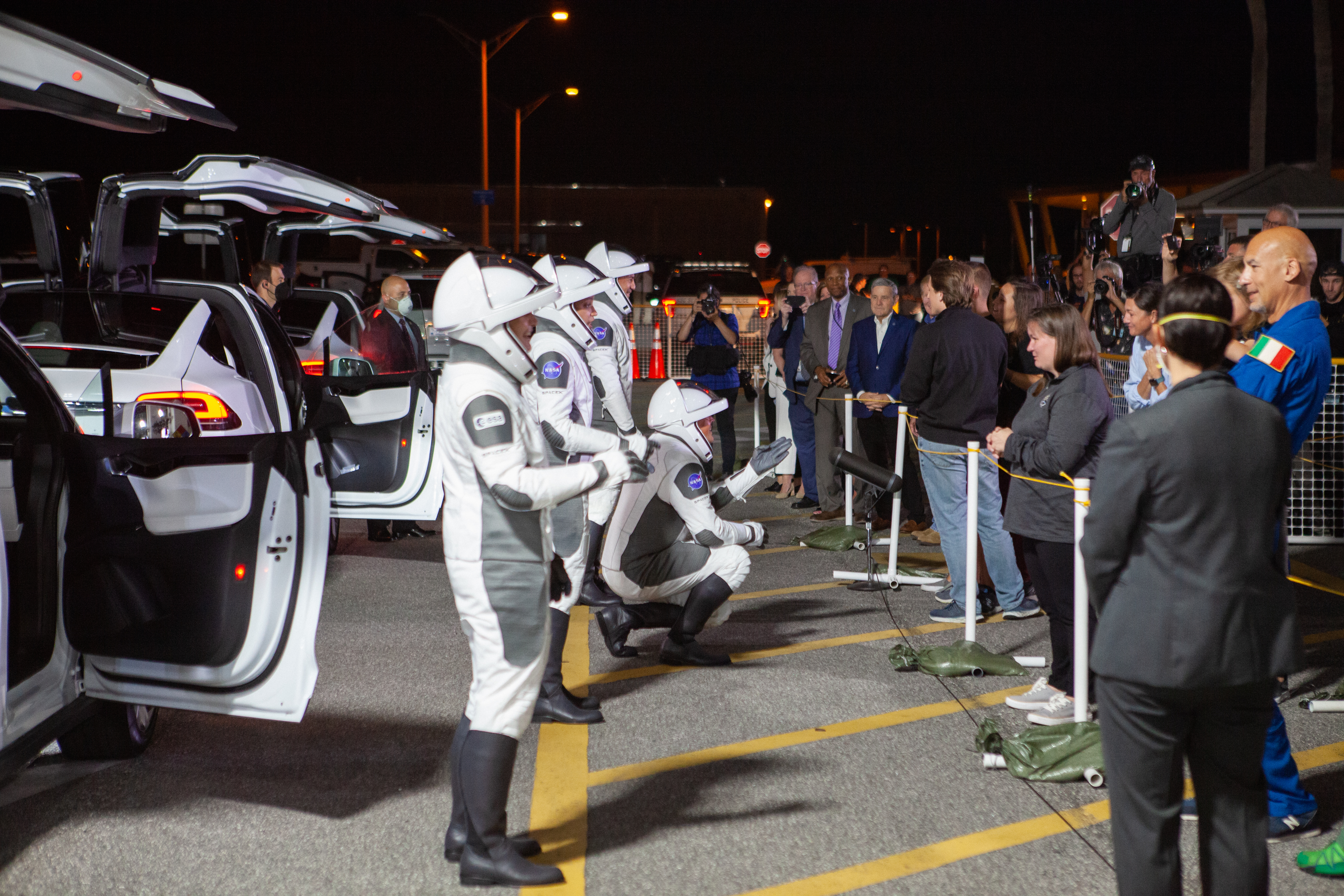 Crew-4 astronauts Kjell Lindgren, Samantha Cristoforetti, Bob Hines, and Jessica Watkins wave to their families outside of the Neil Armstrong Operations and Checkout Building at NASA’s Kennedy Space Center in Florida before getting into the customized Tesla Model X vehicles that will transport them to their spacecraft at Launch Complex 39A. SpaceX’s Crew Dragon, powered by the company’s Falcon 9 rocket, will carry the four-person crew to the International Space Station as part of NASA’s Commercial Crew Program. Crew-4 is scheduled to launch today at 3:52 a.m. EDT, from Pad 39A at Kennedy.