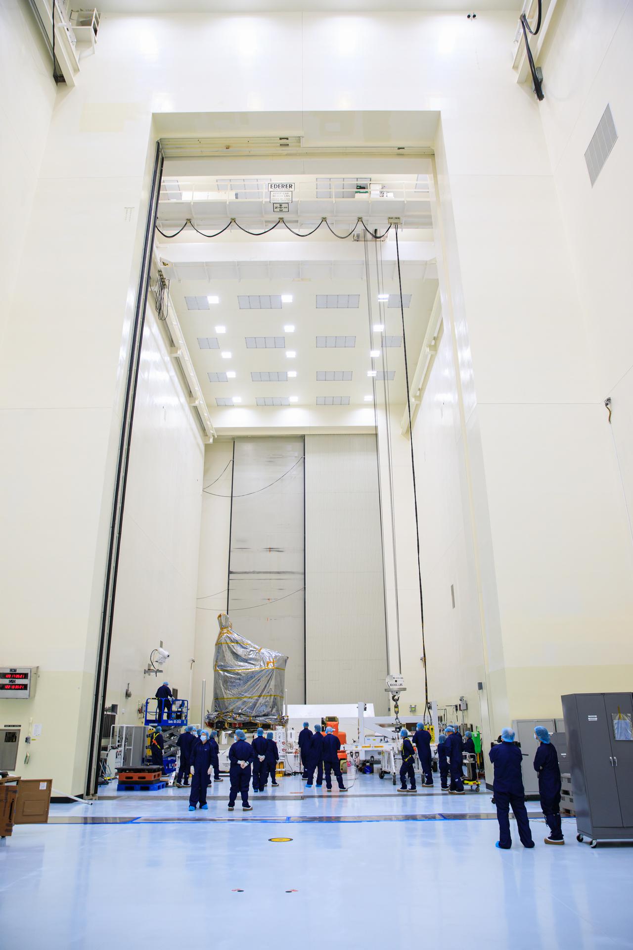 Inside the Payload Hazardous Servicing Facility (PHSF) at NASA's Kennedy Space Center, technicians prepare to move the agency’s Psyche spacecraft – recently removed from its shipping container and inside a protective covering – to a work stand on May 2, 2022. Psyche is scheduled to launch aboard a SpaceX Falcon Heavy rocket on Aug. 1, 2022. The spacecraft will use solar-electric propulsion to travel approximately 1.5 billion miles to rendezvous with its namesake asteroid in 2026. The Psyche mission is led by Arizona State University. NASA’s Jet Propulsion Laboratory, which is managed for the agency by Caltech in Pasadena, California, is responsible for the mission’s overall management, system engineering, integration and testing, and mission operations. Maxar Technologies in Palo Alto, California, provided the high-power solar electric propulsion spacecraft chassis. NASA’s Launch Services Program (LSP), based at Kennedy, is managing the launch. Psyche will be the 14th mission in the agency's Discovery program and LSP’s 100th primary mission.