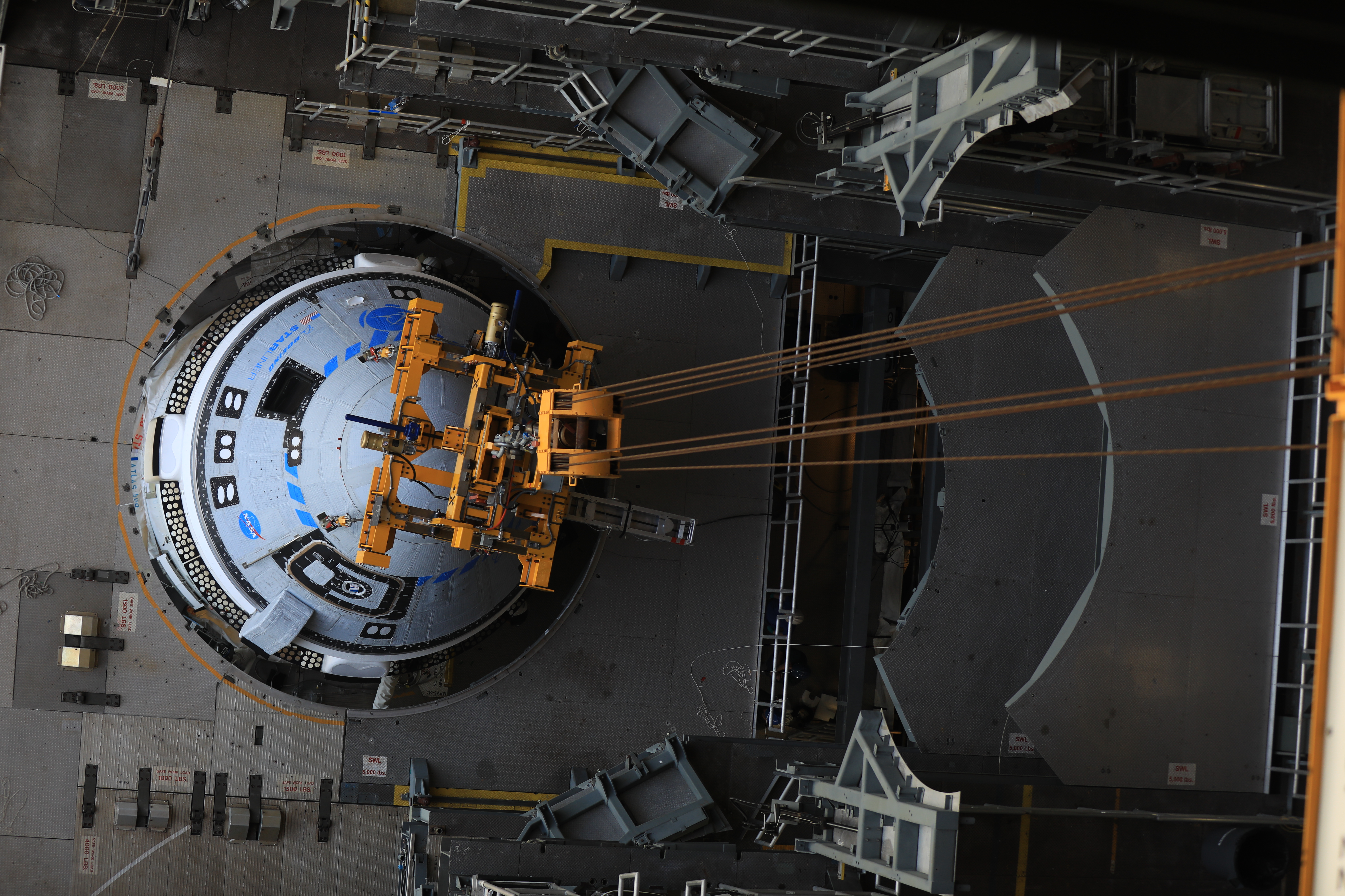 The Boeing CST-100 Starliner spacecraft is lifted at the Vertical Integration Facility at Space Launch Complex-41 at Florida’s Cape Canaveral Space Force Station on May 4, 2022. Starliner will be secured atop a United Launch Alliance Atlas V rocket for Boeing’s second Orbital Flight Test (OFT-2) to the International Space Station for NASA’s Commercial Crew Program. The spacecraft rolled out from Boeing’s Commercial Crew and Cargo Processing Facility at NASA’s Kennedy Space Center earlier in the day.