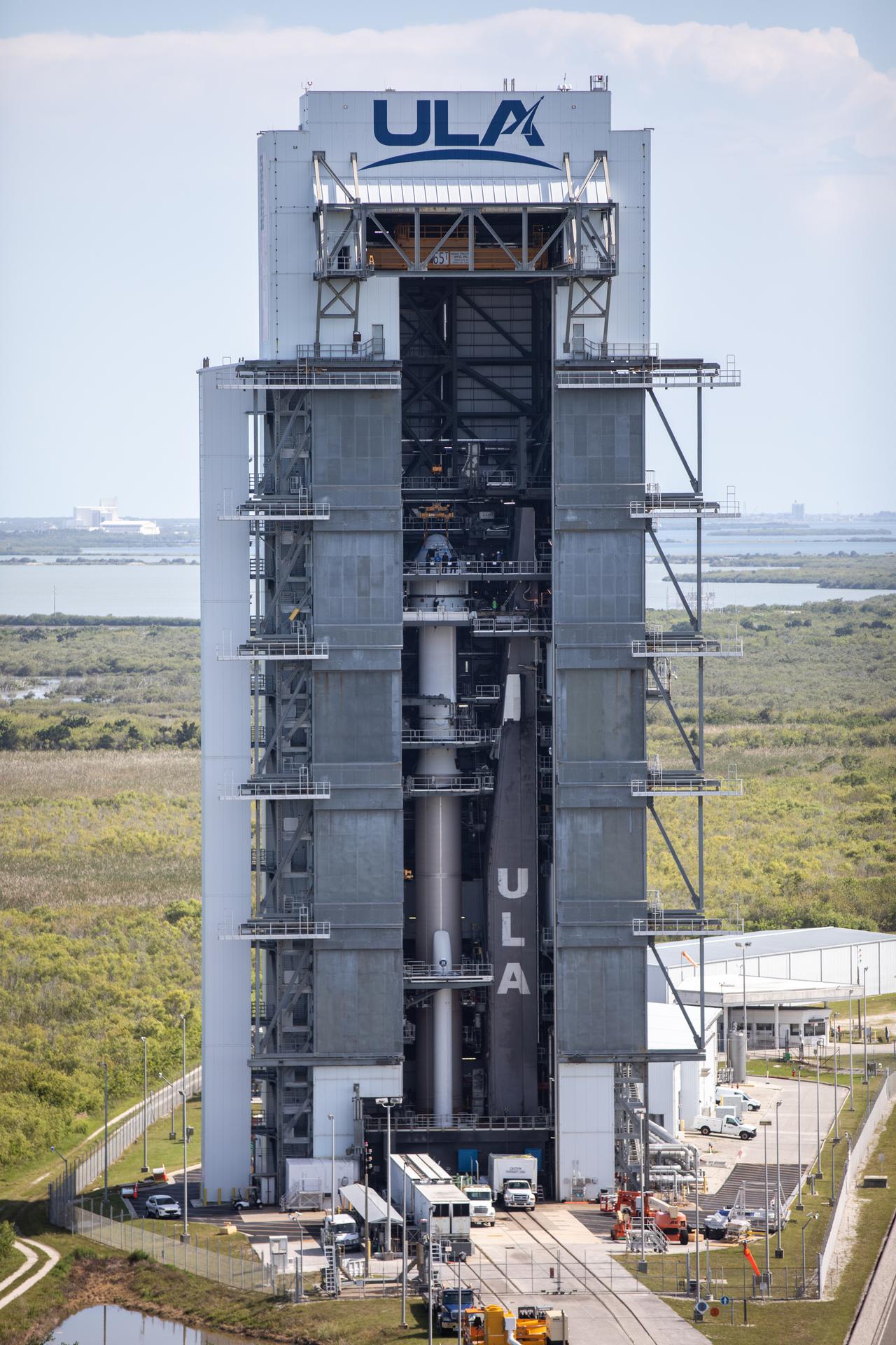 The Boeing CST-100 Starliner spacecraft is lifted at the Vertical Integration Facility at Space Launch Complex-41 at Florida’s Cape Canaveral Space Force Station on May 4, 2022. Starliner will be secured atop a United Launch Alliance Atlas V rocket for Boeing’s second Orbital Flight Test (OFT-2) to the International Space Station for NASA’s Commercial Crew Program. The spacecraft rolled out from Boeing’s Commercial Crew and Cargo Processing Facility at NASA’s Kennedy Space Center earlier in the day.