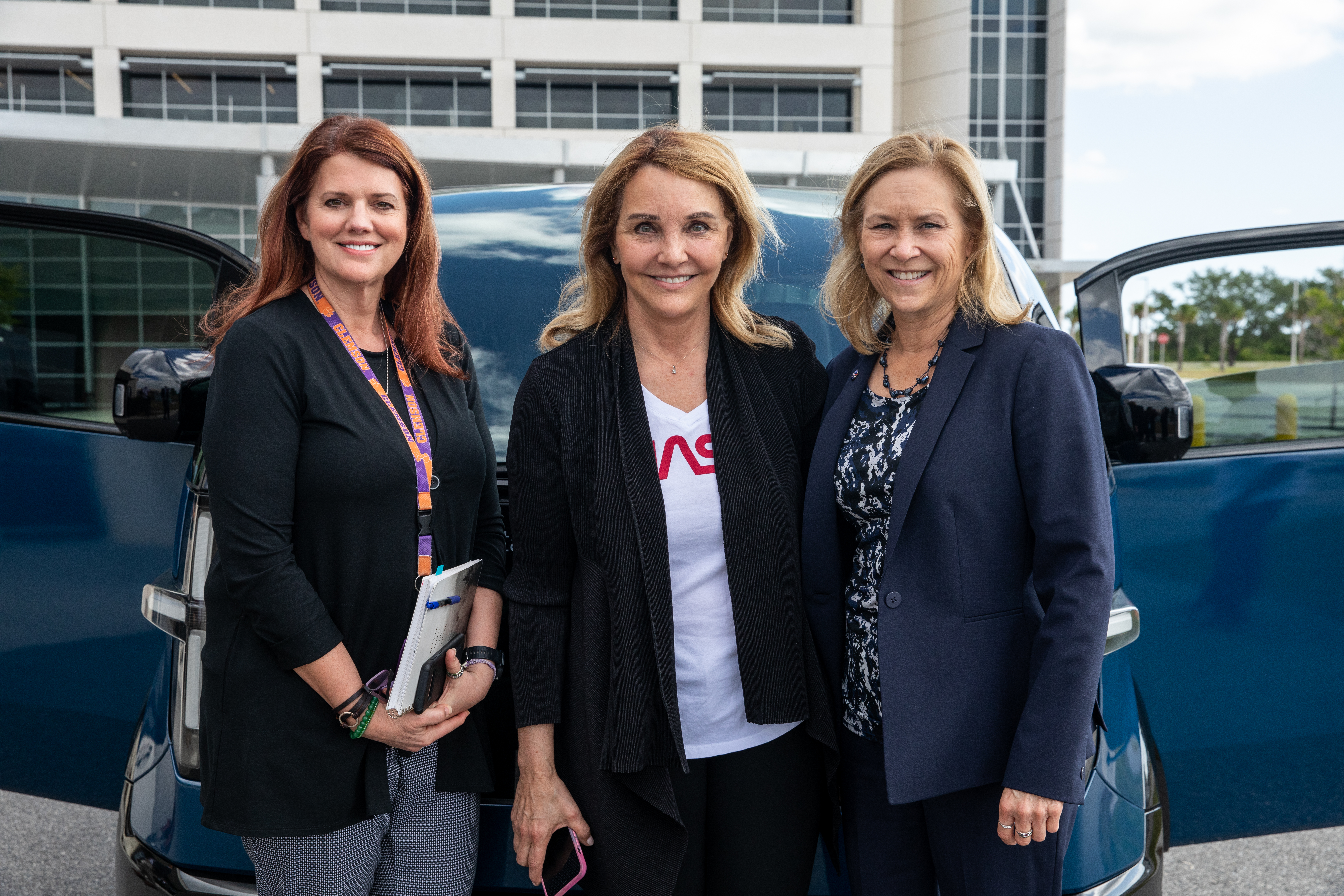 Kennedy Space Center Director Janet Petro, at right test drives a concept design crew transportation vehicle (CTV) for Artemis crewed missions on May 11, 2022. With her, from left, are Charlie Blackwell-Thompson, Artemis I launch director, and Josette Sheeran, president of Canoo Technologies, Inc.. Canoo Technologies Inc., was awarded a contract to design and provide the next generation of CTVs for the Artemis crewed missions. Representatives with Canoo were at the spaceport demonstrating the environmentally friendly fleet of vehicles. Artemis II will be the first Artemis mission flying crew aboard Orion. In later missions, NASA will land the first woman and the first person of color on the surface of the Moon, paving the way for a long-term lunar presence and serving as a steppingstone on the way to Mars.