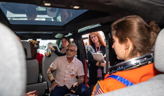 Technicians from Johnson Space Center, dressed in flight suits, secure themselves inside a prototype of a crew transportation vehicle (CTV) for Artemis crewed missions for a test drive near the Neil Armstrong Operations and Checkout Building at NASA’s Kennedy Space Center in Florida on May 11, 2022. Canoo Technologies Inc., was awarded a contract to design and provide the next generation of CTVs for the Artemis crewed missions Representatives with Canoo were at the spaceport demonstrating the environmentally friendly fleet of vehicles. Also in view near the vehicle’s door is Artemis I Launch Director Charlie Blackwell Thompson, and at left, is Anthony Aquila, chief executive officer of Canoo Technologies Inc.. Artemis II will be the first Artemis mission flying crew aboard Orion. In later missions, NASA will land the first woman and the first person of color on the surface of the Moon, paving the way for a long-term lunar presence and serving as a steppingstone on the way to Mars.