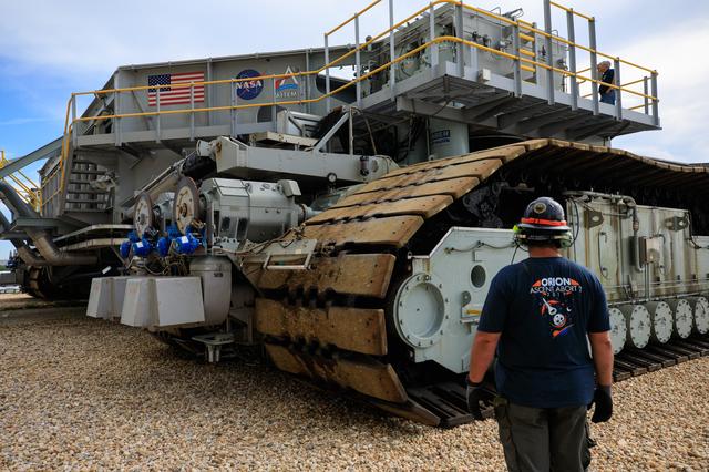 A technician checks the giant tracks crawler-transporter 2 during its trip to the Vehicle Assembly Building (VAB) at NASA’s Kennedy Space Center in Florida on June 3, 2022. The crawler will go inside the VAB, where it will slide under the Artemis I Space Launch System with the Orion spacecraft atop on the mobile launcher and carry it to Launch Complex 39B for a wet dress rehearsal test ahead of the Artemis I launch. Artemis I will be the first integrated test of the SLS and Orion spacecraft. In later missions, NASA will land the first woman and the first person of color on the surface of the Moon, paving the way for a long-term lunar presence and serving as a steppingstone on the way to Mars.