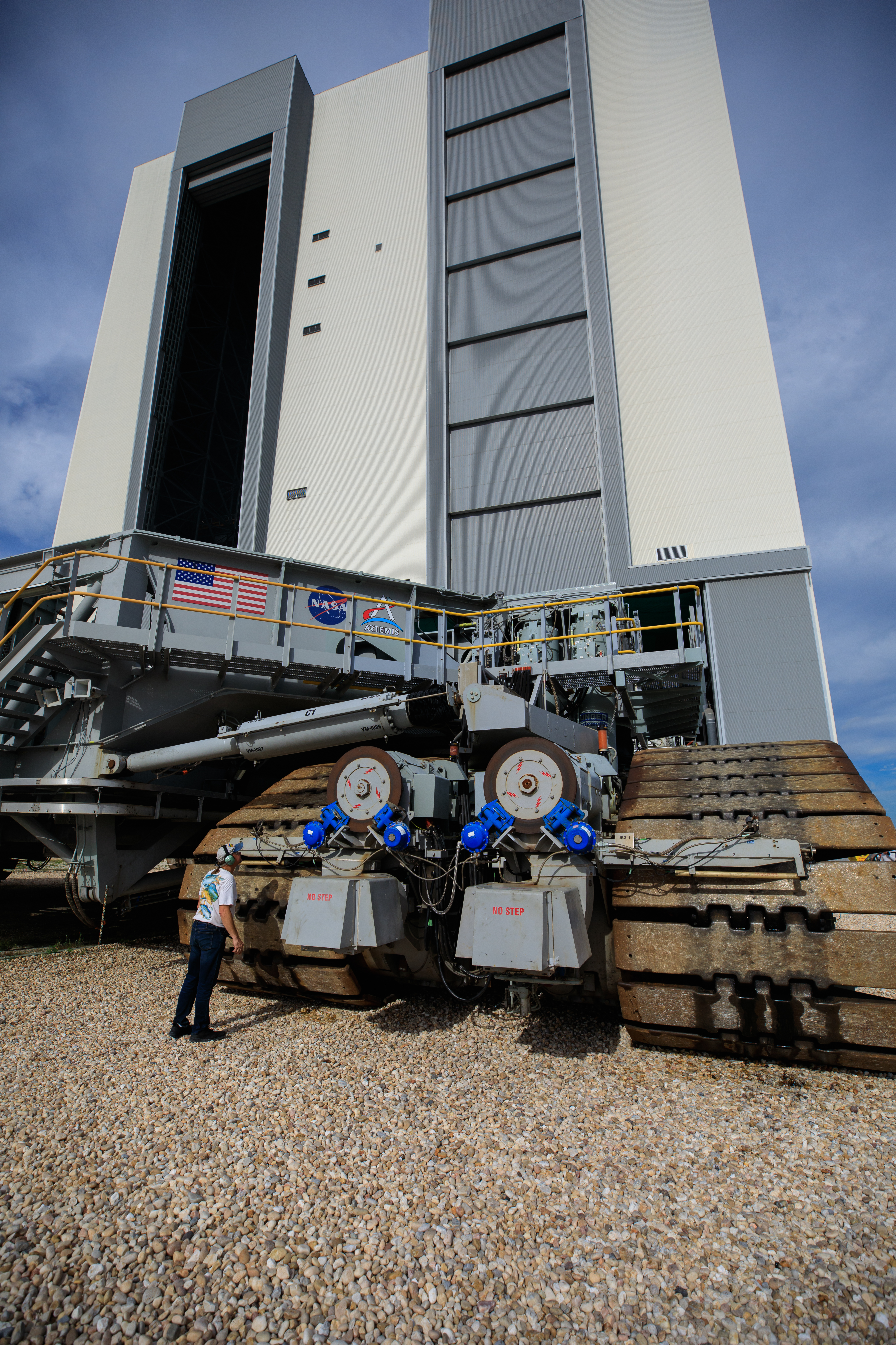 The crawler-transporter, driven by engineers, approaches the Vehicle Assembly Building (VAB) at NASA’s Kennedy Space Center in Florida on June 1, 2022. The crawler will go inside the VAB, where it will slide under the Artemis I Space Launch System with the Orion spacecraft atop on the mobile launcher and carry it to Launch Complex 39B for a wet dress rehearsal test ahead of the Artemis I launch. Artemis I will be the first integrated test of the SLS and Orion spacecraft. In later missions, NASA will land the first woman and the first person of color on the surface of the Moon, paving the way for a long-term lunar presence and serving as a steppingstone on the way to Mars.