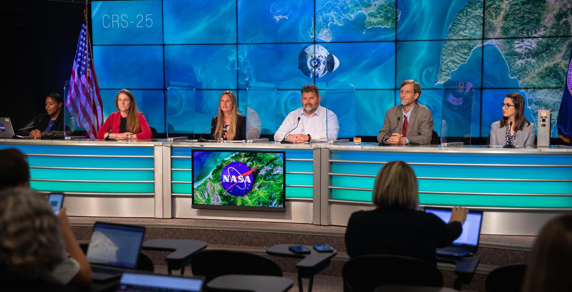 A climate conversation is held at NASA’s Kennedy Space Center in Florida on July 13, 2022, leading up to SpaceX’s 25th Commercial Resupply Services mission for NASA to the International Space Station. Participants, from left are Moderator Tylar Greene, NASA Communications; Kate Calvin, NASA’s chief scientist and climate advisor; Heidi Parris, associate scientist, International Space Station Program; Mike Roberts, chief scientist, ISS National Lab; Rob Green, JPL senior research scientist and EMIT (Earth Surface Mineral Dust Source Investigation) principal investigator; and Paula do Vale Pereira, BeaverCube, Massachusetts Institute of Technology. The Dragon capsule atop SpaceX’s Falcon 9 rocket is scheduled to lift off from Kennedy’s Launch Complex 39A on July 14 at 8:44 p.m. EDT. Dragon will deliver more than 5,800 pounds of cargo, including a variety of NASA investigations, to the space station.