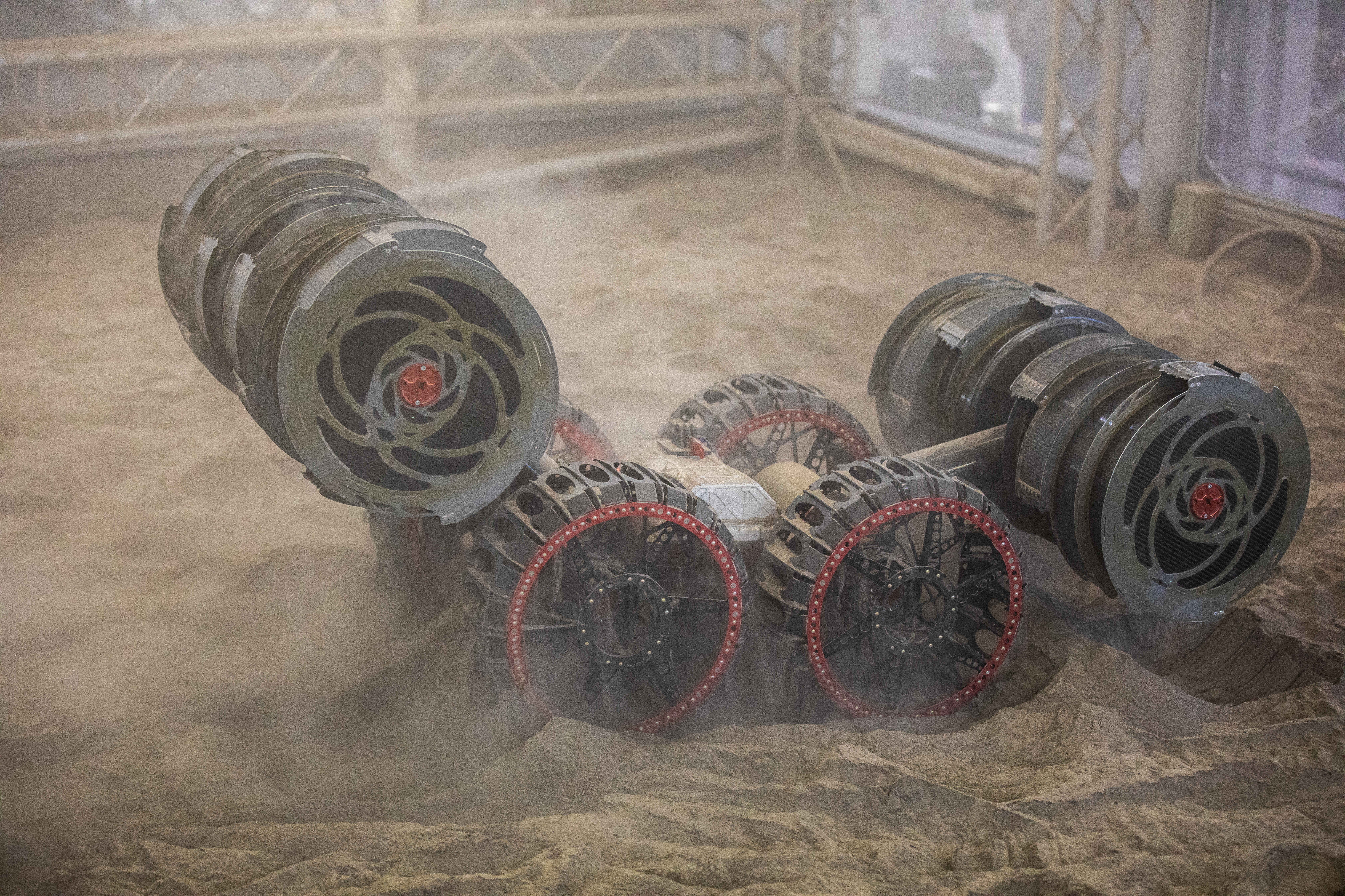 The ISRU Pilot Excavator digs in the regolith bin during testing inside Swamp Works at NASA’s Kennedy Space Center in Florida on July 28, 2022. Tests use a gravity assist offload system to simulate reduced gravity conditions found on the Moon. On the surface of the Moon, mining robots like the Pilot Excavator will excavate the regolith and take the material to a processing plant where usable elements such as hydrogen, oxygen and water can be extracted for life support systems. The Pilot Excavator can scoop up icy regolith which can be used to make operations on the Moon sustainable.