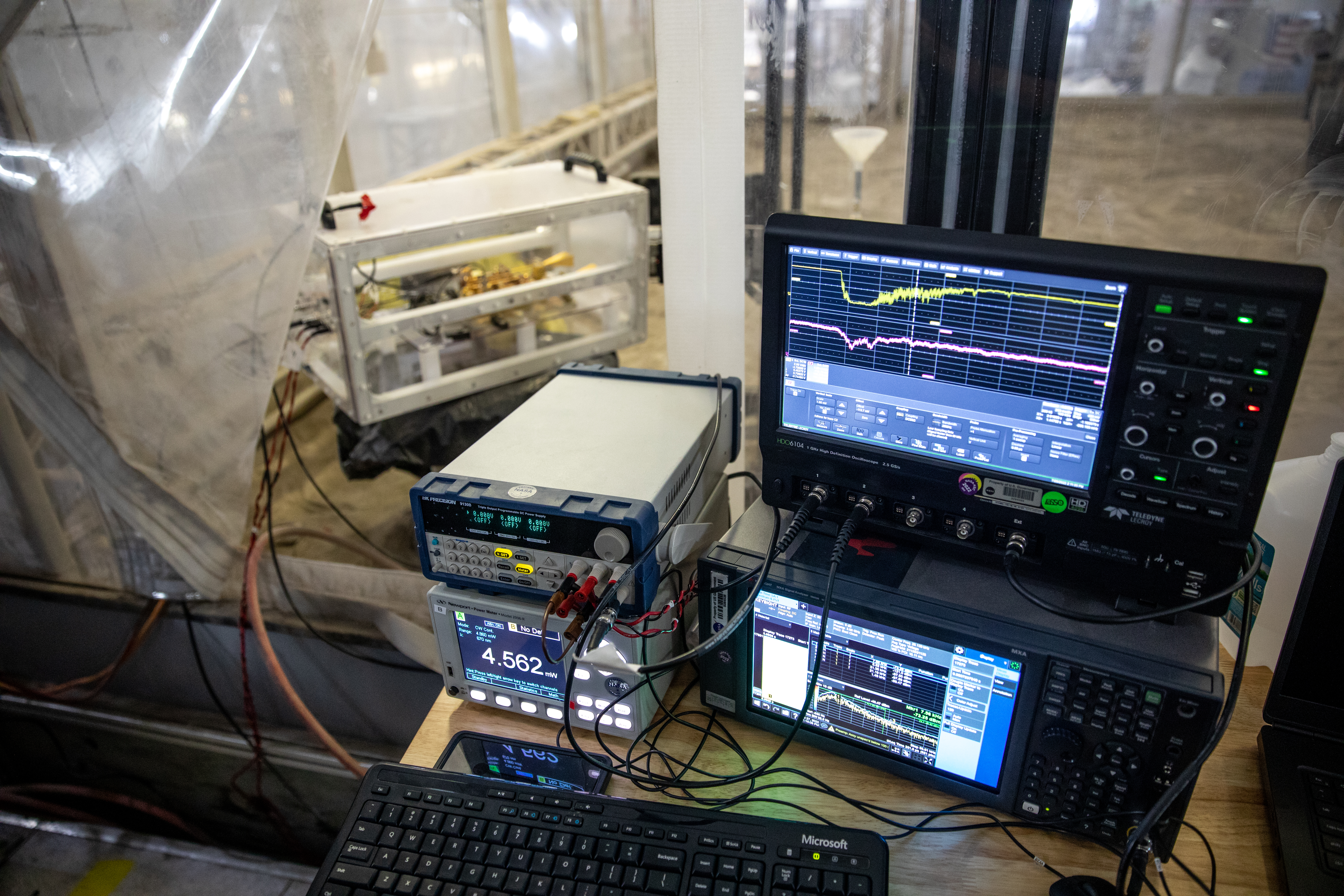 The Dust Concentration Monitor and the Millimeter Wave Doppler Radar undergo testing inside a regolith bin at the Granular Mechanics and Regolith Operations (GMRO) lab at the Kennedy Space Center’s Swamp Works on July 28, 2022, as part of Plume Surface Interaction (PSI) Instrumentation testing. The PSI Project is advancing both modeling and testing capabilities to understand exactly how rocket exhaust plumes affect a planetary landing site. This advanced modeling will help engineers evaluate the risks of various plumes on planetary surfaces, which will help them more accurately design landers for particular locations.