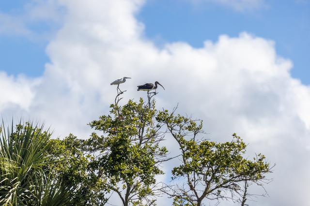 NASA Kennedy Space Center’s Spaceport Integration and Services organization is leading a restoration project at KARS Park on Hall Road in Merritt Island, Florida. As part of this project, a wavebreak is being created about 20 feet offshore to allow mangroves and other plants to propagate into the gap, providing protection for the shoreline. Show here in a tree are a snowy egret, left, and a limpkin.