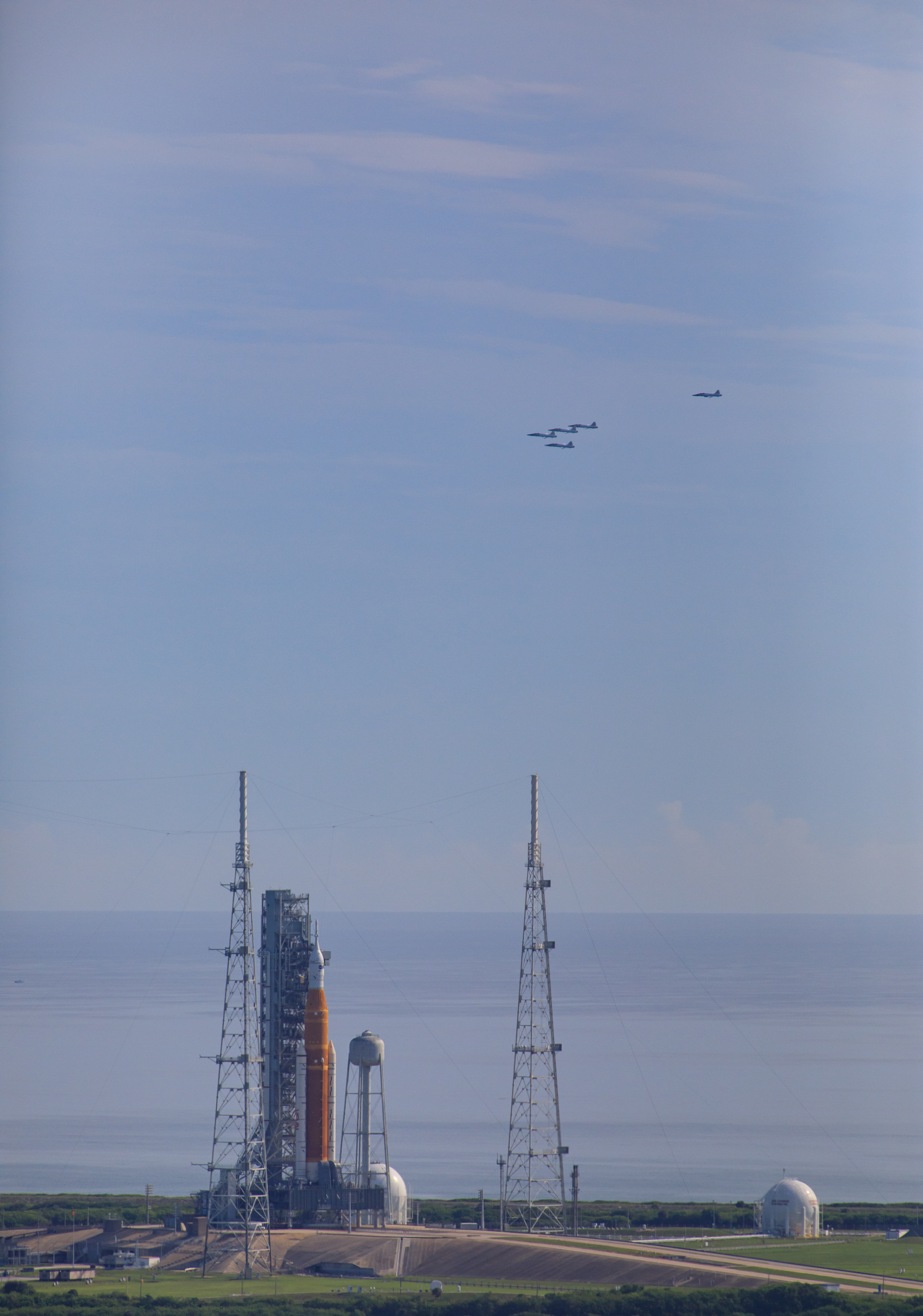 Ahead of NASA’s Artemis I launch, a flight of T-38 supersonic trainer aircraft from the Johnson Space Center Aircraft Operations Division flies in formation over the agency’s Space Launch System and Orion spacecraft on the pad at Launch Complex 39B at Kennedy Space Center in Florida, on Aug. 23, 2022. Pilots and passengers of the five aircraft include NASA Research Pilot Chris Condon and NASA Astronaut Zena Cardman in the lead plane, followed by NASA astronaut candidate Nicole Ayers and NASA astronaut Christina Koch in the second plane, Canadian Space Agency astronaut Jeremy Hansen and NASA astronaut Drew Morgan in the third plane, NASA astronaut Reid Wiseman and NASA astronaut Joe Acaba in the fourth plane, and NASA astronaut candidate Jack Hathaway and Josh Valcarcel, NASA photographer, in the chase plane. Artemis I is scheduled to launch at 8:33 a.m. EDT on Aug. 29, 2022. The first in a series of increasingly complex missions, Artemis I will provide a foundation for human deep space exploration and demonstrate our commitment and capability to extend human presence to the Moon and beyond. The primary goal of Artemis I is to thoroughly test the integrated systems before crewed missions by operating the spacecraft in a deep space environment, testing Orion’s heat shield, and recovering the crew module after reentry, descent, and splashdown.