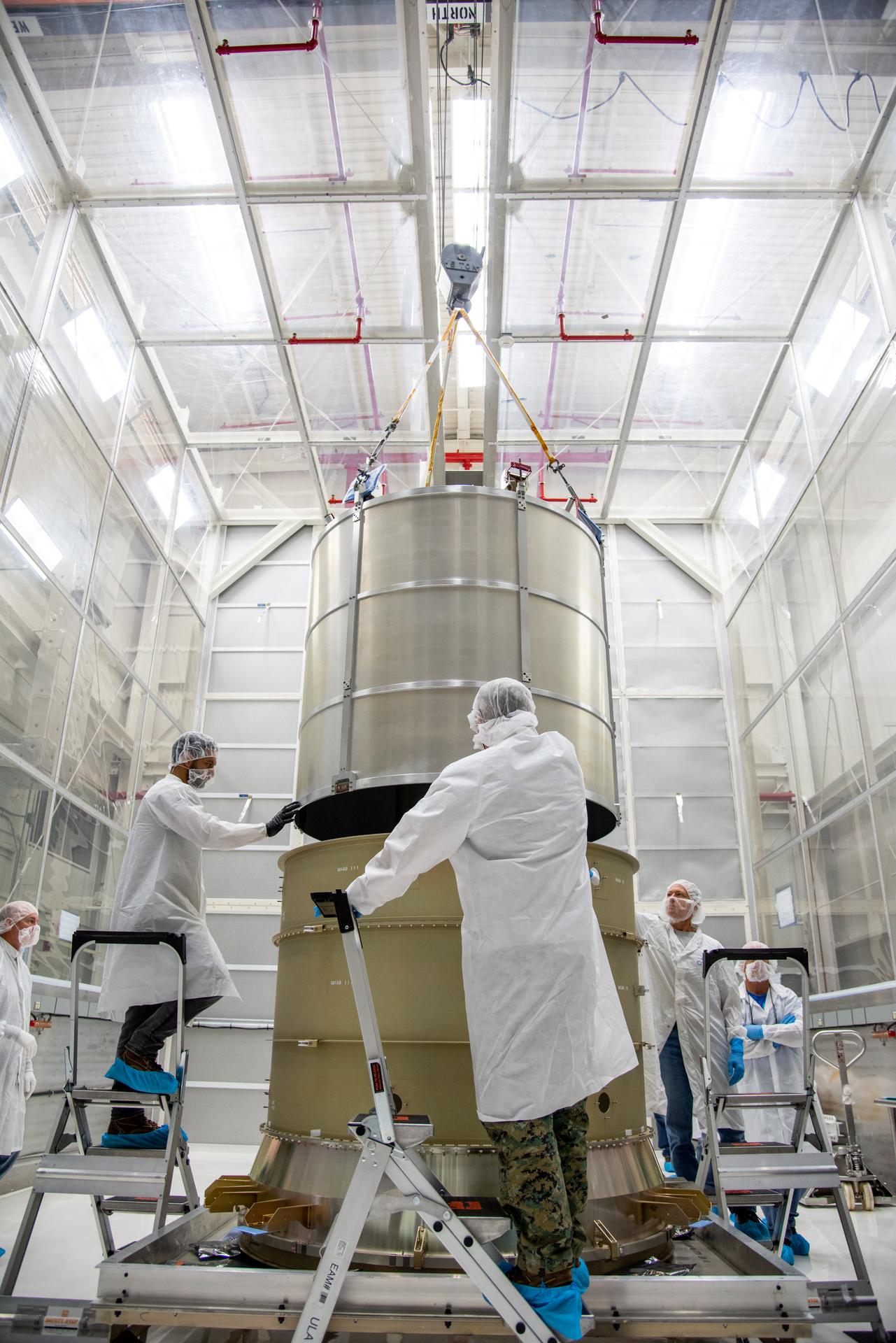 Technicians lower the payload adapter separation systems canister for the Low-Earth Orbit Flight Test of an Inflatable Decelerator (LOFTID) into the payload adapter canister as part of launch preparations inside Building 836 at Vandenberg Space Force Base (VSFB) in California on Sept. 1, 2022. LOFTID is the secondary payload on NASA and the National Oceanic and Atmospheric Administration’s (NOAA) Joint Polar Satellite System-2 (JPSS-2) satellite mission. JPSS-2 is the third satellite in the Joint Polar Satellite System series. It is scheduled to lift off from VSFB on Nov. 1 from Space Launch Complex-3. JPSS-2, which will be renamed NOAA-21 after reaching orbit, will join a constellation of JPSS satellites that orbit from the North to the South pole, circling Earth 14 times a day and providing a full view of the entire globe twice daily. LOFTID will demonstrate inflatable heat shield technology that could enable a variety of proposed NASA missions to destinations such as Mars, Venus, and Titan, as well as returning heavier payloads from low-Earth orbit.