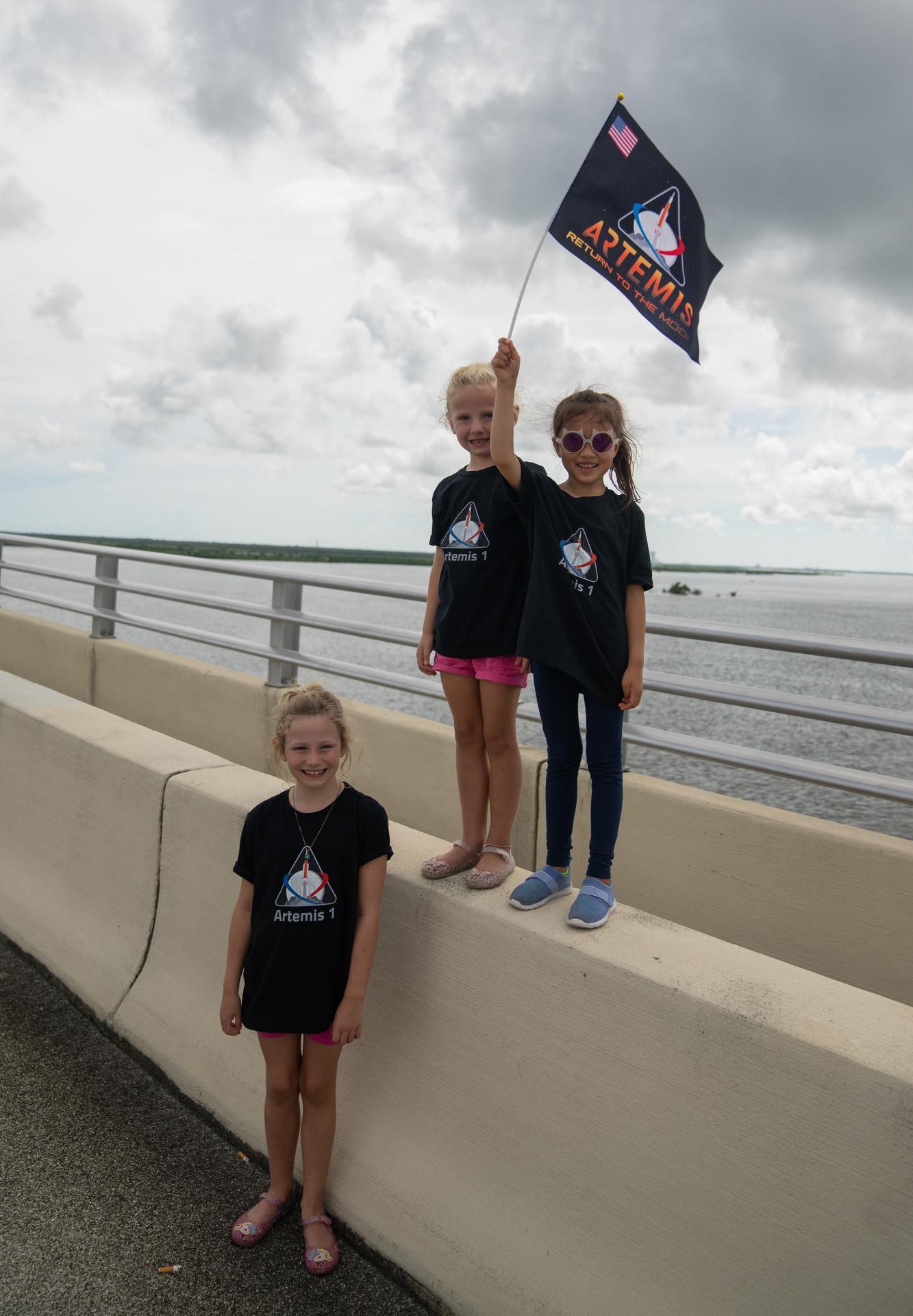 A group of young children with an Artemis flag are photographed on the Max Brewer Bridge in Titusville, Florida, as they wait to watch the launch of NASA’s Artemis I mission on Sept. 3, 2022. The launch was waived off for the day. The first in a series of increasingly complex missions, Artemis I will provide a foundation for human deep space exploration and demonstrate our commitment and capability to extend human presence to the Moon and beyond. The primary goal of Artemis I is to thoroughly test the integrated systems before crewed missions by operating the spacecraft in a deep space environment, testing Orion’s heat shield, and recovering the crew module after reentry, descent, and splashdown.