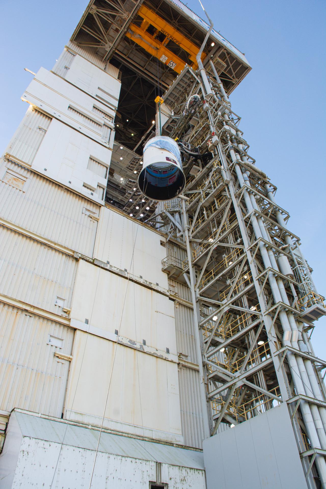 The United Launch Alliance Atlas V interstage adapter and aft stub adapter are hoisted up at the vertical integration facility at Space Launch Complex-3 at Vandenberg Space Force Base in California on Sept. 29, 2022. The adapter will be moved into the integration facility and secured atop the ULA Atlas V in preparation for the launch of the National Oceanic and Atmospheric Administration’s (NOAA) Joint Polar Satellite System-2 (JPSS-2). JPSS-2 and NASA’s Low-Earth Orbit Flight Test of an Inflatable Decelerator (LOFTID) secondary payload are scheduled to lift off from VSFB on Nov. 1 from SLC-3. JPSS-2, which will be renamed NOAA-21 after reaching orbit, will join a constellation of JPSS satellites that orbit from the North to the South pole, circling Earth 14 times a day and providing a full view of the entire globe twice daily. The NOAA/NASA Suomi National Polar-orbiting Partnership (Suomi NPP) satellite, and NOAA-20, previously known as JPSS-1, are both already in orbit. Each satellite carries at least four advanced instruments to measure weather and climate conditions on Earth. LOFTID is dedicated to the memory of Bernard Kutter. LOFTID will demonstrate inflatable heat shield technology that could enable a variety of proposed NASA missions to destinations such as Mars, Venus, and Titan, as well as returning heavier payloads from low-Earth orbit.