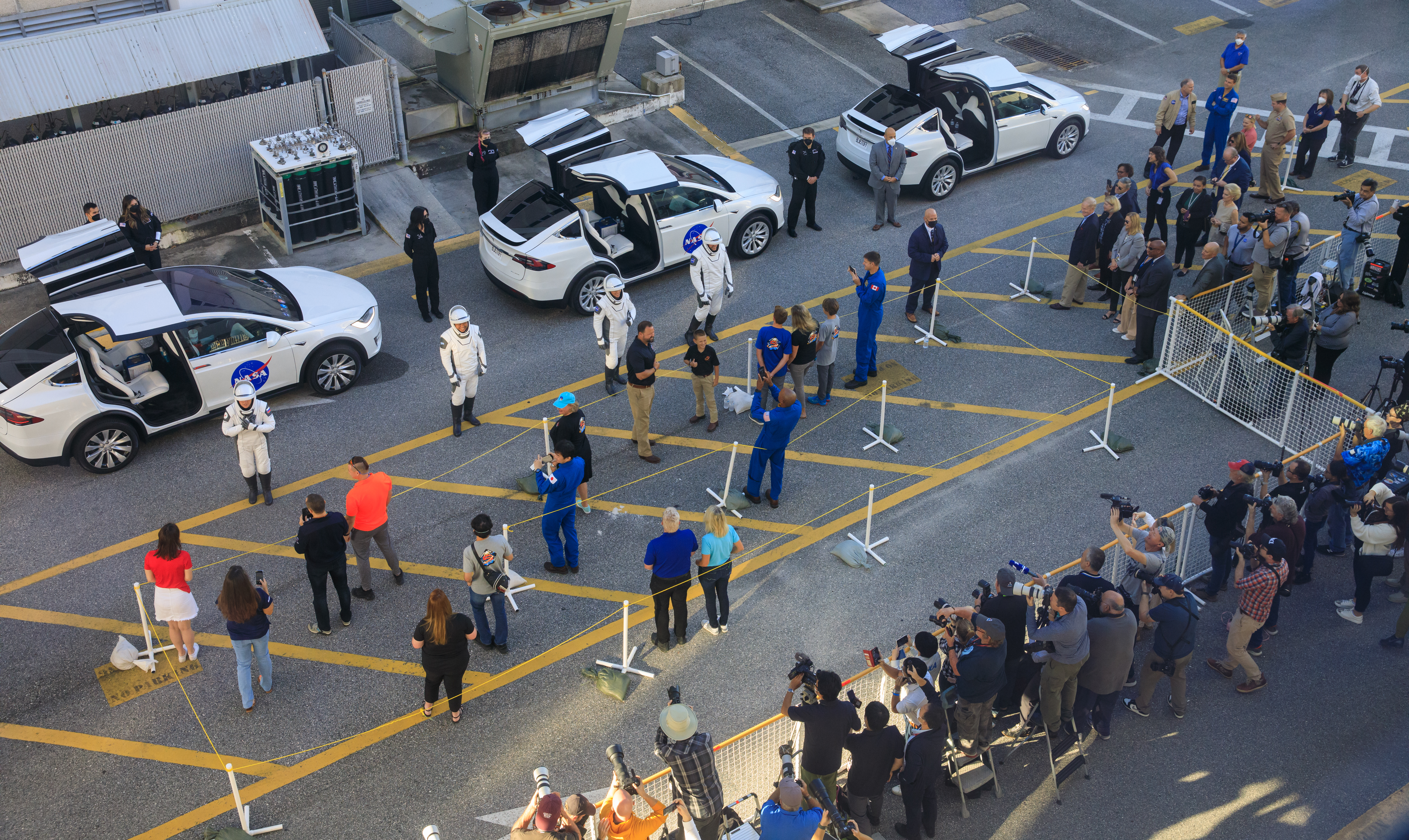 NASA’s SpaceX Crew-5 say goodbye to friends and family after exiting the Neil A. Armstrong Operations and Checkout Building at NASA’s Kennedy Space Center in Florida on Oct. 5, 2022. From left are Mission Specialists Anna Kikina, Roscosmos cosmonaut, and Koichi Wakata, of JAXA (Japan Aerospace Exploration Agency), and NASA astronauts Nicole Mann, spacecraft commander, and Josh Cassada, pilot. They will board two Tesla vehicles for the trip to Kennedy’s Launch Complex 39A, where they will launch to the International Space Station aboard SpaceX’s Dragon Endurance spacecraft for a science expedition mission as part of NASA’s Commercial Crew Program. SpaceX’s Falcon 9 rocket lifted off at noon EDT.