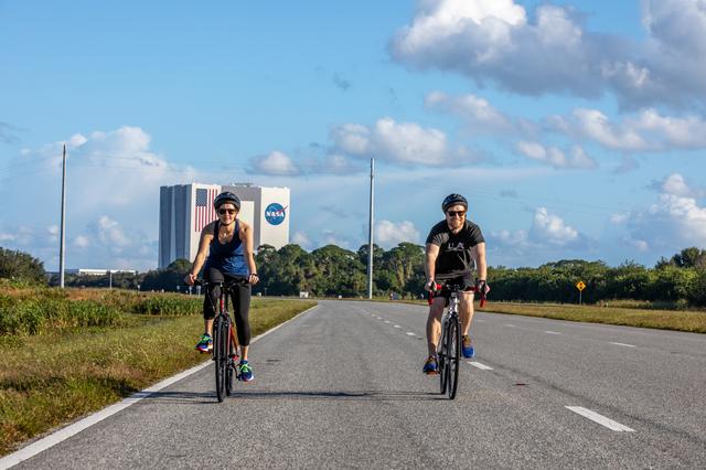 Two cyclists participate in the Diamond Tour de KSC at NASA’s Kennedy Space Center in Florida on Oct. 22, 2022. In the background is the iconic Vehicle Assembly Building. This unique event, held for the first time since 2019, was part of the Safety organization’s Fall Into Safety and Health event, and named “diamond” to honor the center’s 60th anniversary. Cyclists covered three different routes and rode by historic landmarks, completing a total of about 37 miles.