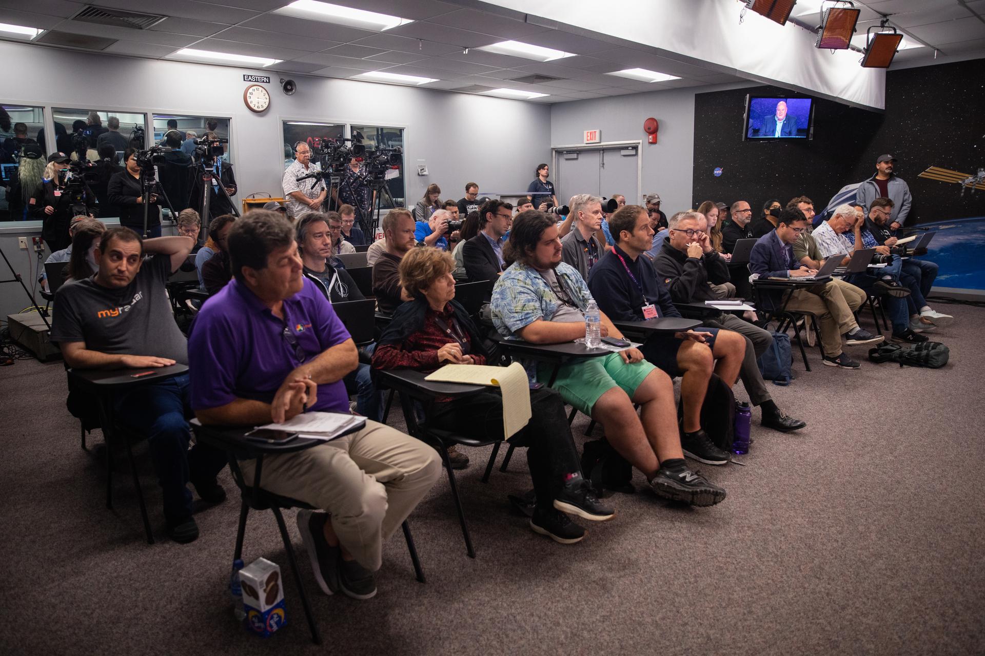 Members of the media attend a postlaunch news conference on Nov. 16, 2022, at NASA’s Kennedy Space Center in Florida, after launch of Artemis I at 1:47 a.m. EST from Kennedy’s Launch Complex 39B. Participants were Jackie McGuiness, NASA Communications; Bill Nelson, NASA administrator; Mike Sarafin, Artemis mission manager, NASA Headquarters; Mike Bolger, Exploration Ground Systems Program manager, Kennedy; John Honeycutt, Space Launch System Program manager, Marshall; Howard Hu, Orion Program manager, NASA’s Johnson Space Center; and Emily Nelson, chief flight director, Johnson. The first in a series of increasingly complex missions, Artemis I will provide a foundation for human deep space exploration and demonstrate our commitment and capability to extend human presence to the Moon and beyond. The primary goal of Artemis I is to thoroughly test the integrated systems before crewed missions by operating the spacecraft in a deep space environment, testing Orion’s heat shield, and recovering the crew module after reentry, descent, and splashdown.