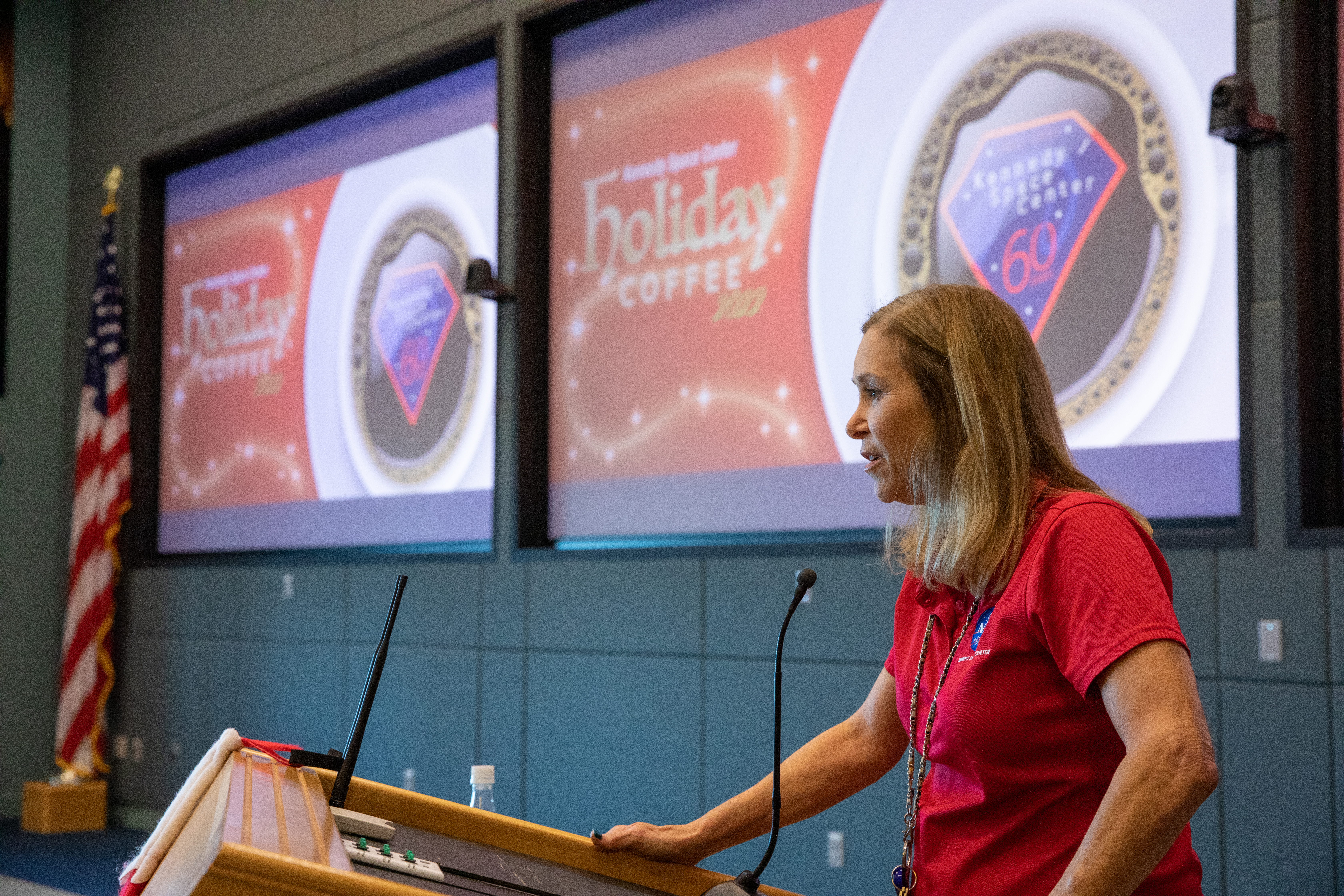 Kennedy Space Center Director Janet Petro speaks during the 2022 Center Director’s Holiday Coffee, on Dec. 7, 2022, at NASA’s Kennedy Space Center in Florida. The annual holiday event is an opportunity for Kennedy employees and NASA retirees to exchange holiday greetings with center leaders and fellow support staff.