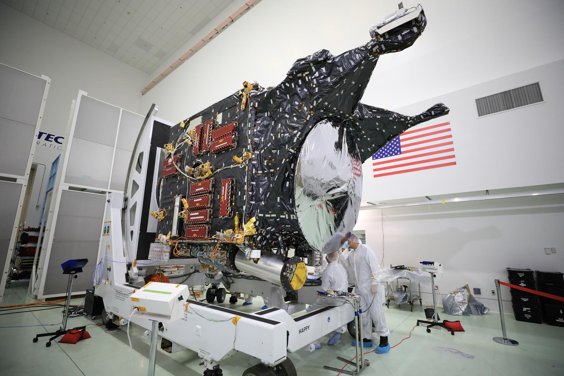 A team prepares NASA’s Psyche spacecraft for launch inside the Astrotech Space Operations Facility near the agency’s Kennedy Space Center in Florida on Dec. 8, 2022. Psyche will launch atop a SpaceX Falcon Heavy rocket from Launch Complex 39A at Kennedy. Launch is targeted for no earlier than Oct. 10, 2023. The spacecraft will use solar-electric propulsion to travel approximately 1.5 billion miles to rendezvous with its namesake asteroid in 2026. The Psyche mission is led by Arizona State University. NASA’s Jet Propulsion Laboratory, which is managed for the agency by Caltech in Pasadena, California, is responsible for the mission’s overall management, system engineering, integration and testing, and mission operations. Maxar Technologies in Palo Alto, California, provided the high-power solar electric propulsion spacecraft chassis. NASA’s Launch Services Program (LSP), based at Kennedy, is managing the launch.