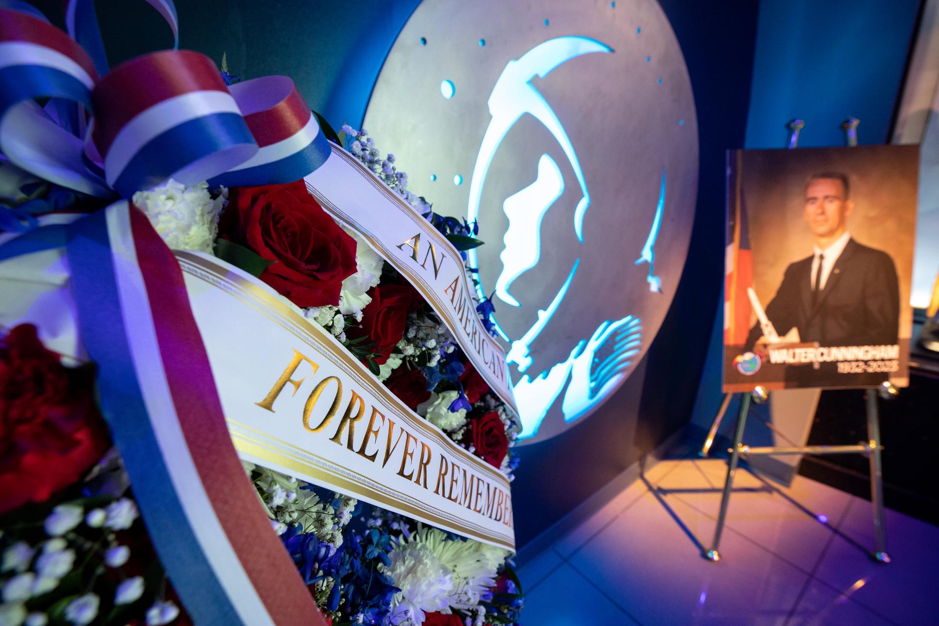 A memorial wreath is placed in the Heroes and Legends exhibit at the Kennedy Space Center Visitor Complex in Florida following a ceremony honoring the memory of former Apollo astronaut Walter Cunningham. The ceremony was held Jan. 9, 2023. Cunningham was the lunar module pilot for Apollo 7 – the first crewed flight test of the Apollo spacecraft – where he tested maneuvers necessary for docking and lunar orbit rendezvous. He passed away Jan. 3 at the age of 90.