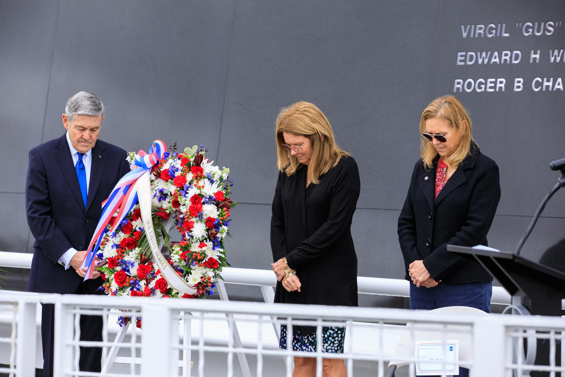 Sheryl Chafee, Astronauts Memorial Foundation (AMF) Board of Directors chairperson, center, accompanied by NASA Associate Administrator Bob Cabana, and Kennedy Space Director Janet Petro, lay a wreath in front of the Space Mirror Memorial during the Day of Remembrance on Jan. 26, 2023, at the Kennedy Space Center Visitor Complex in Florida. The event honored the crews of Apollo 1 and space shuttles Challenger and Columbia, as well as other astronauts who lost their lives in the pursuit of spaceflight. This year marks the 20th anniversary of the Columbia tragedy. This year’s ceremony was hosted by the AMF, which was founded after the shuttle Challenger accident in 1986 to honor the sacrifices of fallen astronauts each year.