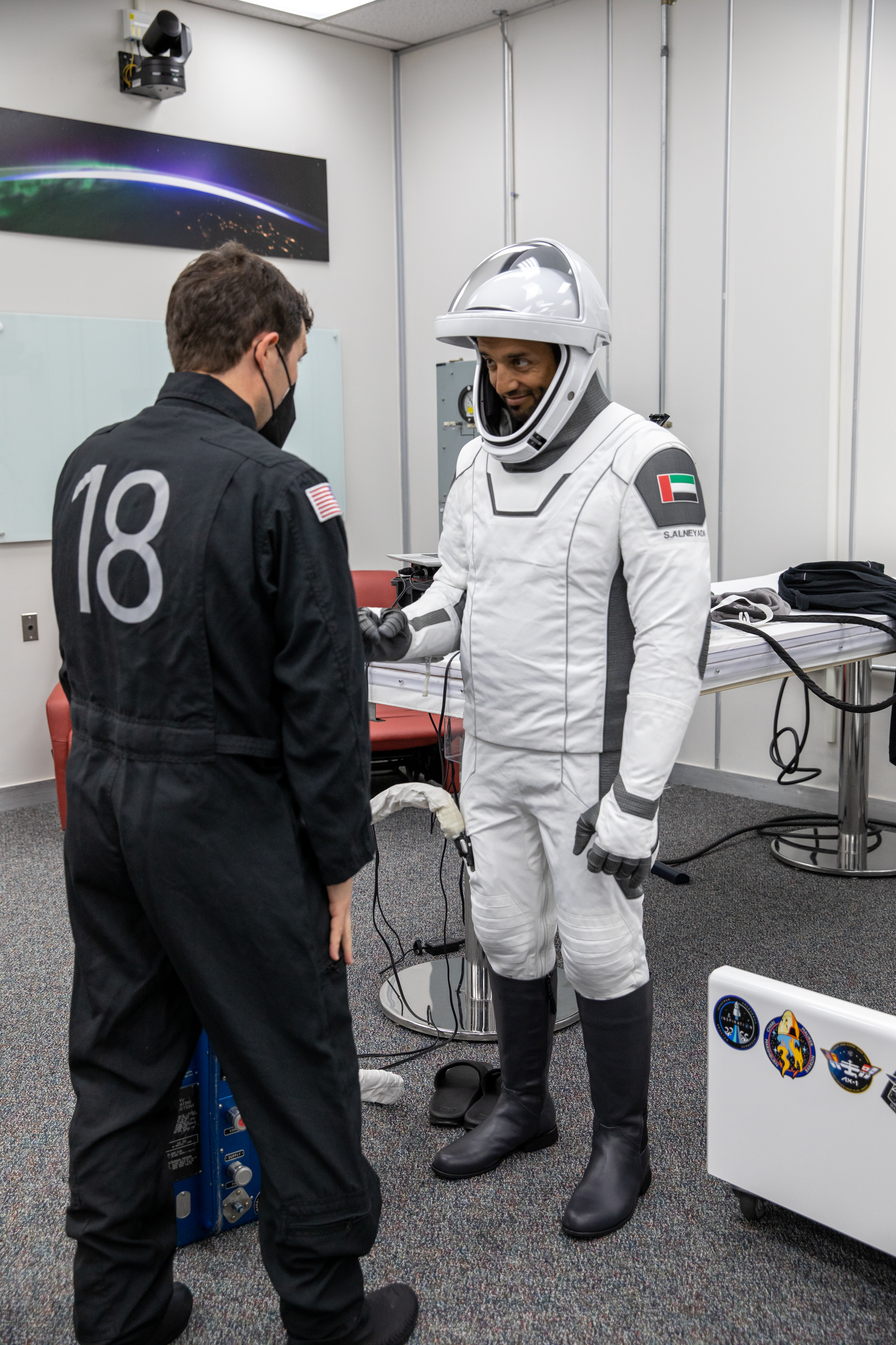 At right, Sultan Alneyadi, UAE (United Arab Emirates) astronaut and mission specialist, checks his spacesuit inside the crew suit-up room in the Neil Armstrong Operations and Checkout Building at NASA’s Kennedy Space Center in Florida during a countdown dress rehearsal on Feb. 23, 2023, to prepare for the upcoming Crew-6 launch. The Crew-6 astronauts will launch to the International Space Station aboard the Crew Dragon Endeavour on a SpaceX Falcon 9. Launch is targeted for 1:45 a.m. EST on Feb. 27 from Launch Complex 39A. Crew-6 is the sixth crew rotation mission with SpaceX to the station, and the seventh flight of Dragon with people as part of the agency’s Commercial Crew Program.