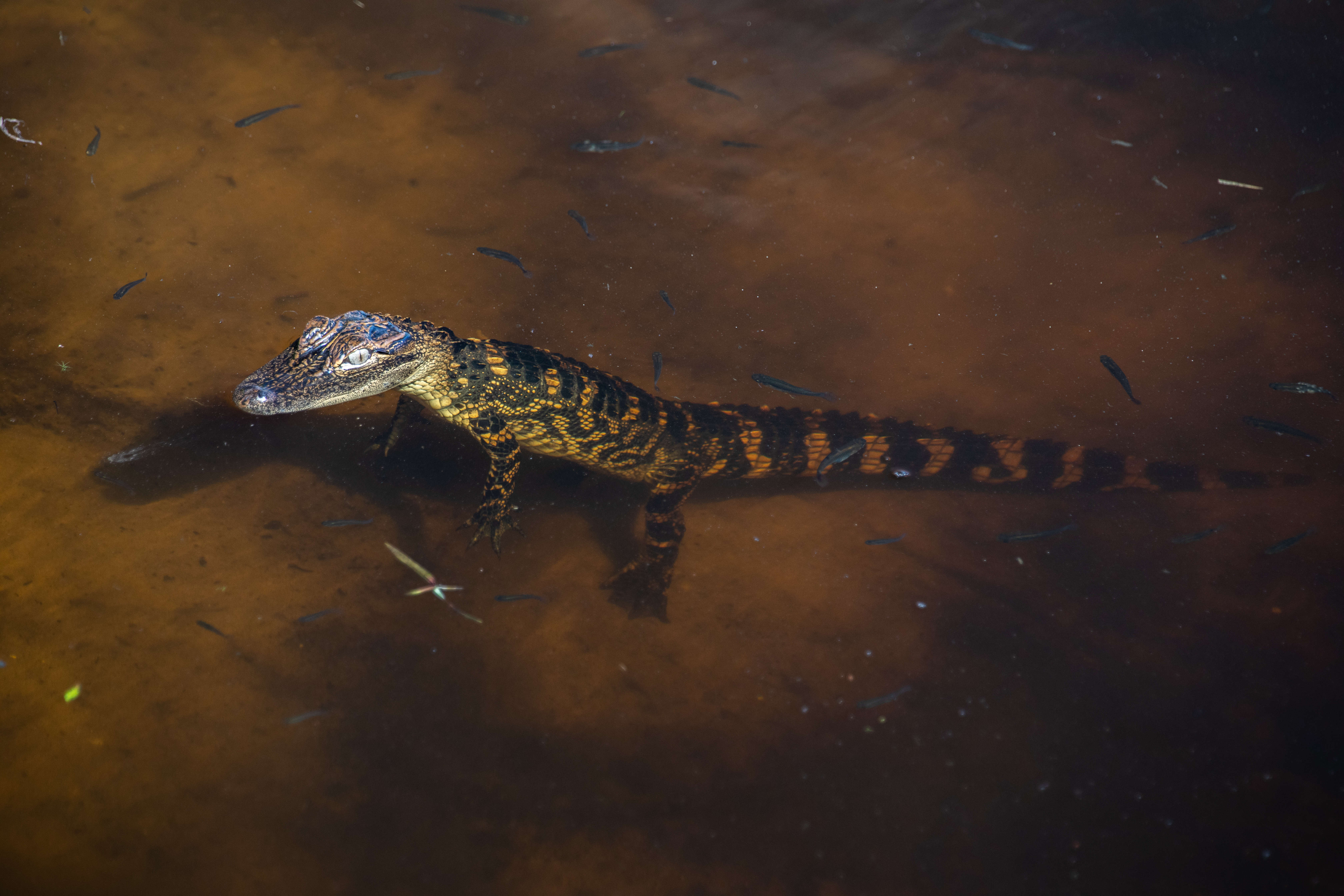 A baby alligator is in view in a waterway at NASA’s Kennedy Space Center in Florida on March 9, 2023. The center shares a boundary with the Merritt Island National Wildlife Refuge. The refuge is home to more than 65 amphibian and reptile species, along with 330 native and migratory bird species, 25 mammal and 117 fish species.