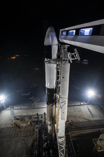 A SpaceX Falcon 9 rocket, with the company’s Dragon spacecraft atop, is secured in the vertical position at NASA Kennedy Space Center’s Launch Complex 39A on March 13, 2023, in preparation for the 27th commercial resupply services launch to the International Space Station. The mission will deliver new science investigations, supplies, and equipment to the crew aboard the space station, including the final two experiments comprising the National Institutes for Health and International Space Station National Laboratory’s Tissue Chips in Space initiative, Cardinal Heart 2.0 and Engineered Heart Tissues-2. Liftoff is scheduled for 8:30 p.m. EDT on Tuesday, March 14, from Kennedy’s Launch Complex 39A