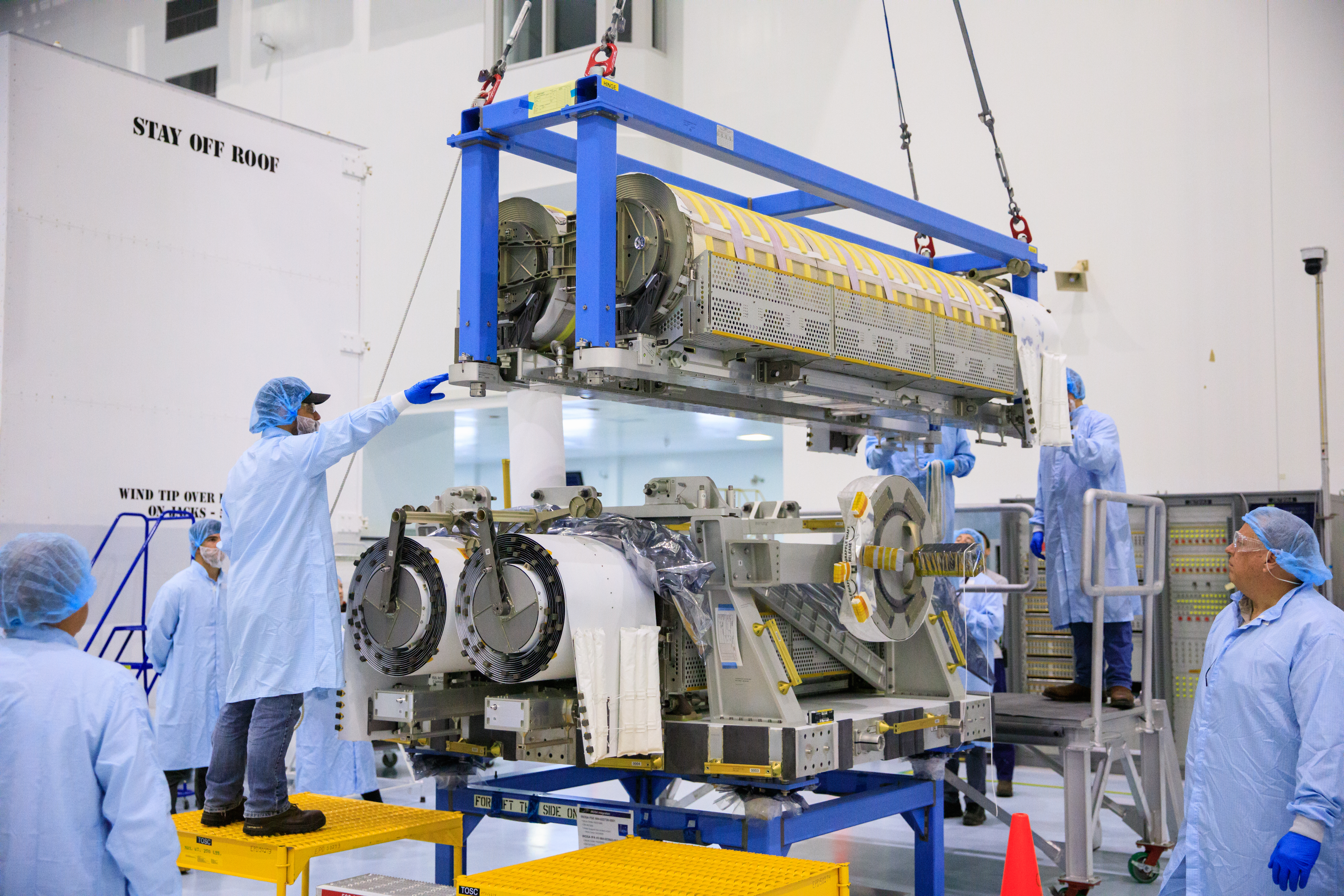 Inside the Space Station Processing Facility high bay at NASA's Kennedy Space Center in Florida, technicians assist as a crane is used to lift and stack the third set of two International Space Station Roll Out Solar Arrays (iROSA) onto a platform on March 23, 2023. They are being prepared for delivery to the space station aboard SpaceX’s Dragon cargo carrier on the company’s 28th commercial resupply services (CRS-28) mission to the space station. iROSA is a new type of solar panel that rolls open in space and is more compact than current rigid panel designs.