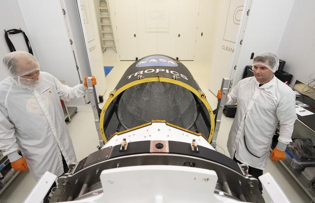 Technicians place NASA’s Time-Resolved Observations of Precipitation structure and storm Intensity with a Constellation of Smallsats (TROPICS) CubeSats in Rocket Lab’s Electron payload fairing in a processing facility near Launch Complex 1 in Mahia, New Zealand. TROPICS is scheduled to launch on Monday, May 1, at 1 a.m. New Zealand time from Launch Complex 1, Pad B. TROPICS will provide data on temperature, precipitation, water vapor, and clouds by measuring microwave frequencies, providing insight into storm formation and intensification.