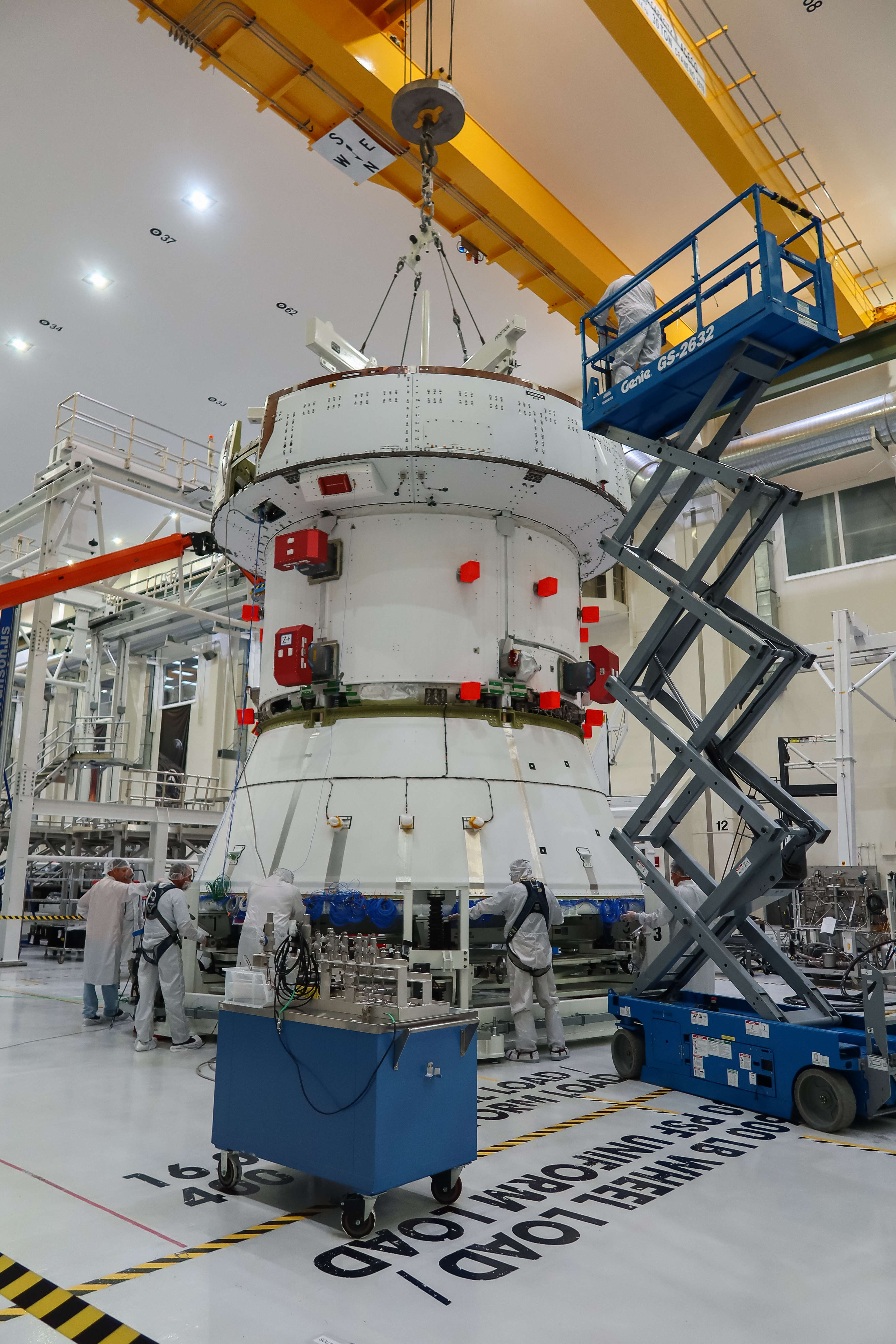 Preparations are underway to lift the European Service Module (ESM) for NASA’s Artemis II mission by crane inside the high bay of the Neil A. Armstrong Operations and Checkout Building at NASA’s Kennedy Space Center in Florida on May 22, 2023. Teams from NASA and Lockheed Martin are preparing the service module for transfer to the FAST (final assembly and system testing) cell for final checkouts before it is stacked with the Orion crew module. The powerhouse that will fuel and propel Orion in space, the ESM will be used for Artemis II, the first Artemis mission flying crew aboard Orion.