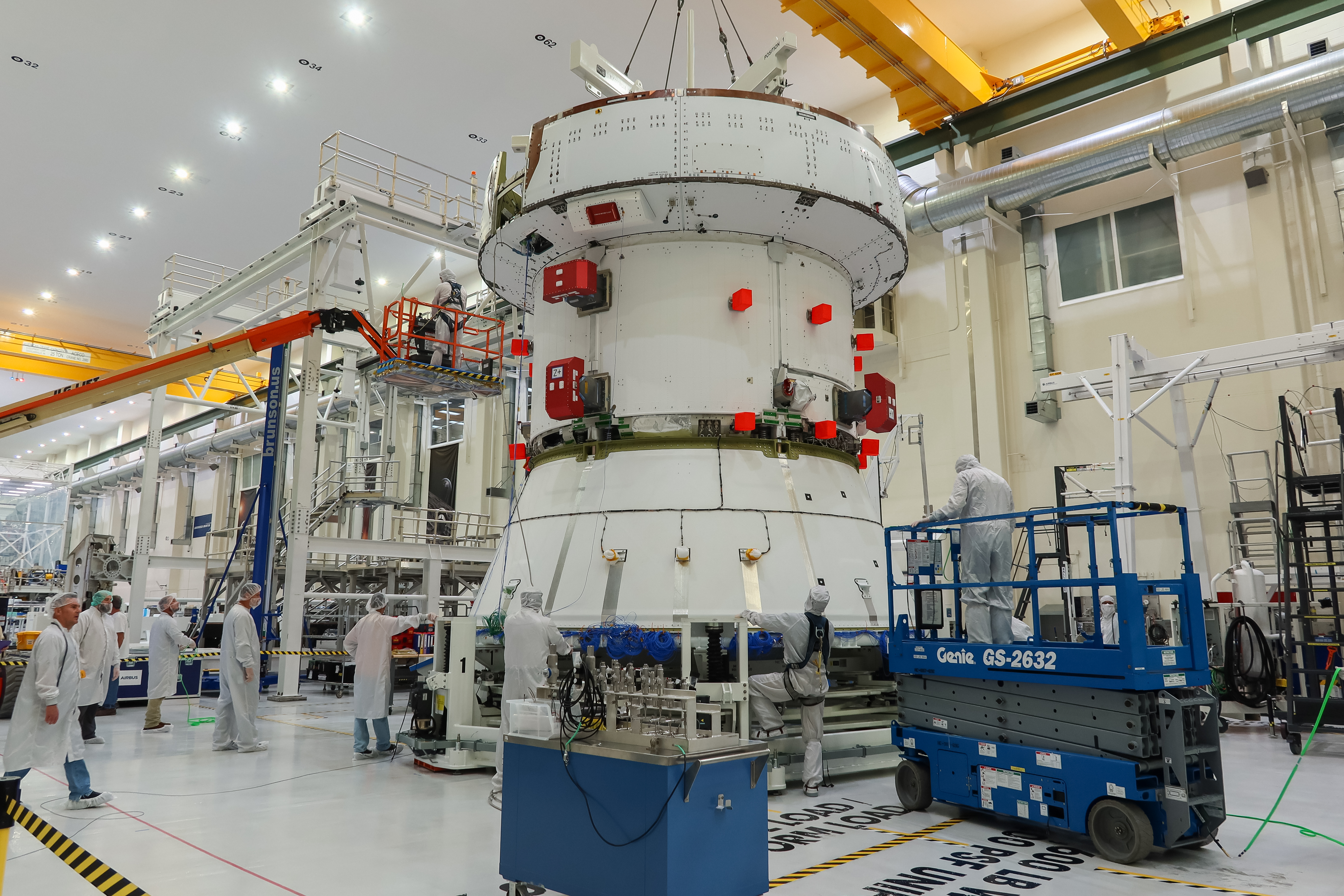 Preparations are underway to lift the European Service Module (ESM) for NASA’s Artemis II mission by crane inside the high bay of the Neil A. Armstrong Operations and Checkout Building at NASA’s Kennedy Space Center in Florida on May 22, 2023. Teams from NASA and Lockheed Martin are preparing the service module for transfer to the FAST (final assembly and system testing) cell for final checkouts before it is stacked with Orion crew module. The powerhouse that will fuel and propel Orion in space, the ESM will be used for Artemis II, the first Artemis mission flying crew aboard Orion.