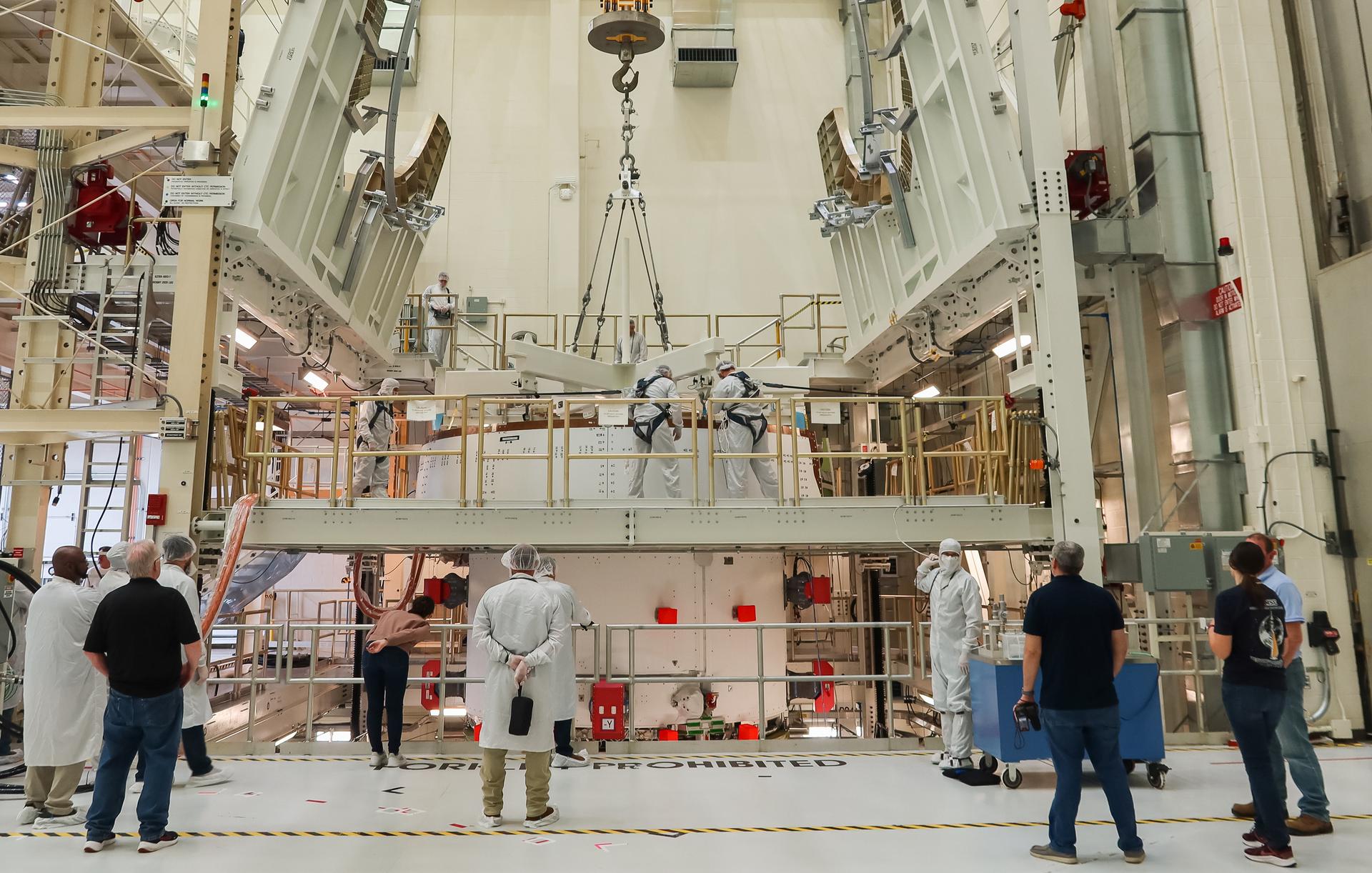 The European Service Module (ESM) for NASA’s Artemis II mission is secured inside the FAST (final assembly and system testing) cell in the high bay of the Neil A. Armstrong Operations and Checkout Building at NASA’s Kennedy Space Center in Florida on May 22, 2023. The ESM is in the FAST cell for final checkouts before it is stacked with the Orion crew module. Technicians are removing the crane that was used to move the ESM. The powerhouse that will fuel and propel Orion in space, the ESM will be used for Artemis II, the first Artemis mission flying crew aboard Orion.