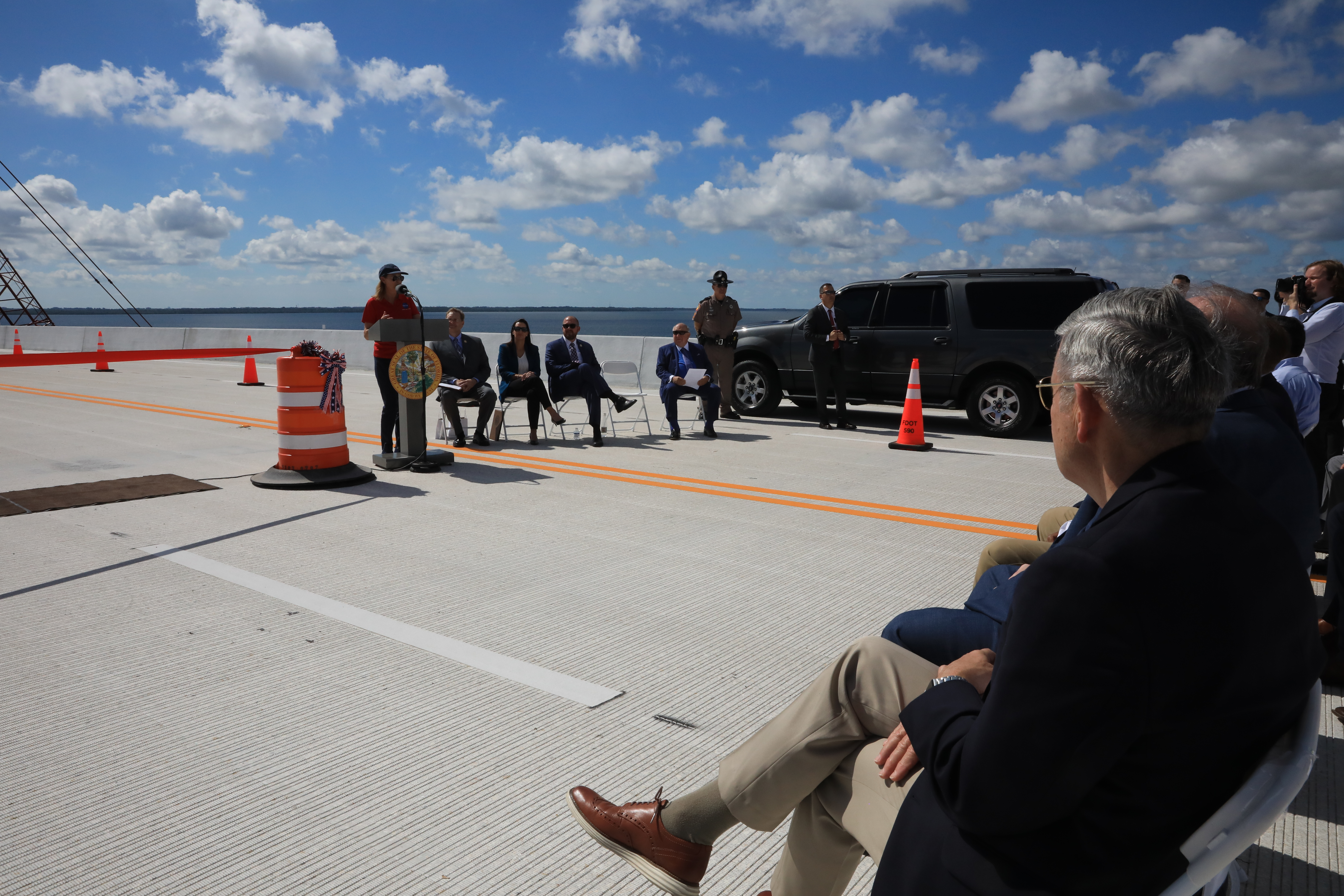 NASA Kennedy Space Center Director Janet Petro speaks during the grand opening ceremony for the upgraded eastbound span of the Indian River Bridge near Kennedy Space Center on June 9, 2023. The new high-rise bridge serves as the primary entrance and exit to the space center for employees and visitors. The bridge spans the Indian River Lagoon and connects Kennedy and the Cape Canaveral Space Force Station to the mainland via State Road 405/NASA Causeway in Titusville. This first section of the bridge replaces the two-lane drawbridge which was built in the mid-1960s to support the Apollo program.
