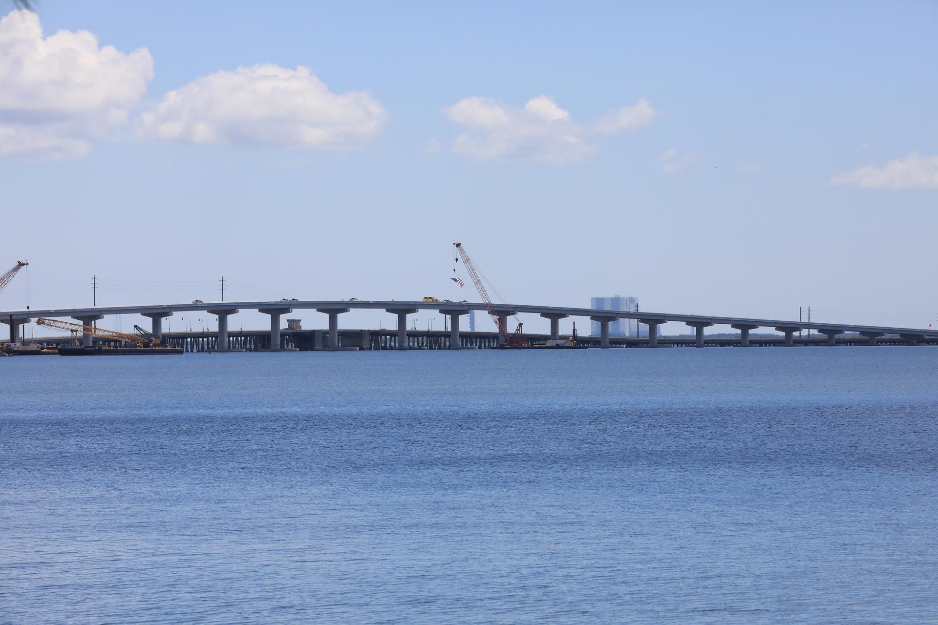 In view is the upgraded eastbound span of the Indian River Bridge leading to NASA’s Kennedy Space Center in Florida. A ribbon cutting ceremony was held June 9, 2023 to officially open the East part of the bridge. The new high-rise bridge serves as the primary entrance and exit to the space center for employees and visitors. The bridge spans the Indian River Lagoon and connects Kennedy and the Cape Canaveral Space Force Station to the mainland via State Road 405/NASA Causeway in Titusville. This first section of the bridge replaces the two-lane drawbridge which was built in the mid-1960s to support the Apollo program.