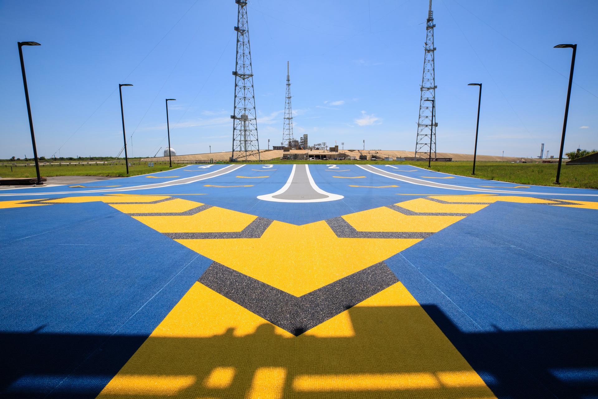Teams with Exploration Ground Systems at NASA’s Kennedy Space Center in Florida continue to work the upgrades and repairs on mobile launcher 1 and Launch Pad 39B on June 13, 2023, ahead of the first critical ground testing for Artemis II. New pavement markings indicate the direction of the emergency egress system terminus from Launch Complex 39B. The team has nearly completed the terminus area, where the emergency egress baskets carrying the astronauts and flight crew will arrive following their safe exit from the mobile launcher. Artemis II will be the first Artemis mission flying crew aboard Orion.