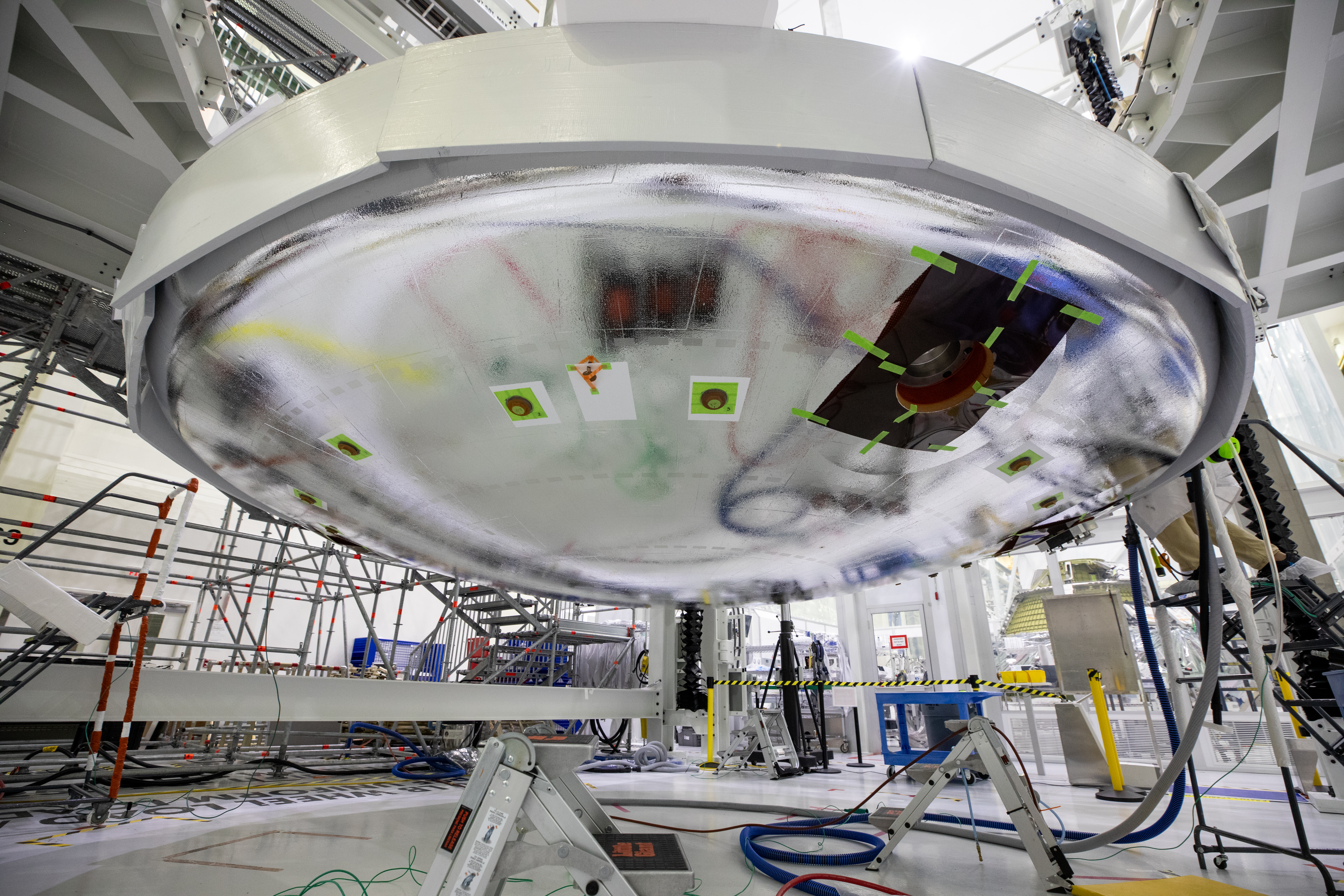 Teams install the heat shield on the Artemis II Orion spacecraft inside the high bay of the Neil Armstrong Operations and Checkout Building at NASA’s Kennedy Space Center in Florida on June 22, 2023. The 16.5-foot-wide shield will ensure the safe return of the astronauts on board as the spacecraft travels at speeds of about 25,000 miles per hour and experiences outside temperatures of nearly 5,000 degrees Fahrenheit. Artemis II will be the first mission with astronauts under Artemis that will test and check out all of Orion’s systems needed for future crewed missions.