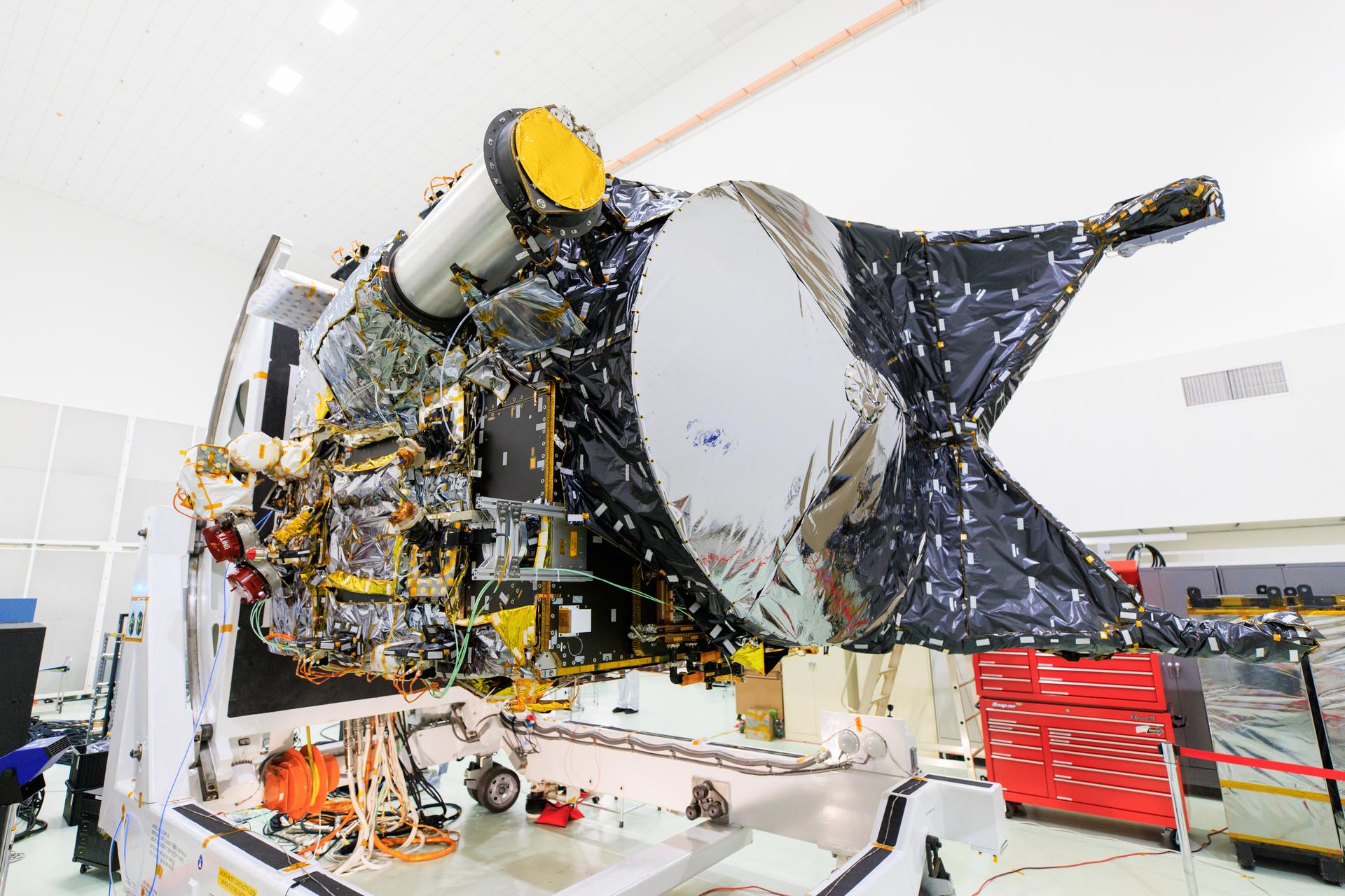 NASA's Psyche spacecraft is shown in a clean room on June 26, 2023, at Astrotech Space Operations Facility near the agency’s Kennedy Space Center in Florida. Engineers and technicians from NASA’s Jet Propulsion Laboratory in Southern California have begun final assembly, test, and launch operations on Psyche, with assembly of the spacecraft all but complete except for the installation of the solar arrays and the imagers. NASA’s Deep Space Optical Communications (DSOC) technology demonstration, testing high-data-rate laser communications, remains integrated into the spacecraft. A final suite of tests will be run on the vehicle, after which it will be fueled and then mated onto a SpaceX Falcon Heavy rocket just prior to launch, targeted for October 2023.