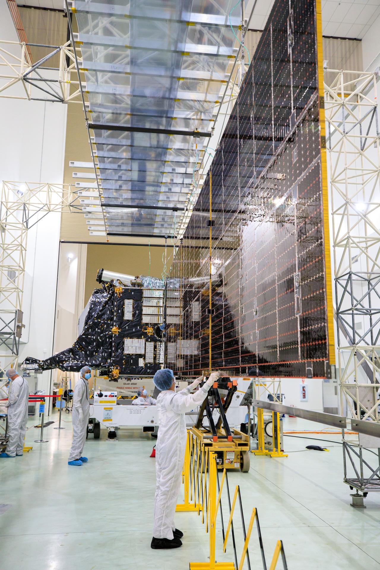 Team members prepare to integrate the second of two solar arrays with the agency’s Psyche spacecraft inside the Astrotech Space Operations Facility near the agency’s Kennedy Space Center in Florida on July 24, 2023. The solar arrays were shipped from Maxar Technologies, in San Jose, California. They are part of the solar electric propulsion system, provided by Maxar, that will power the spacecraft on its journey to explore a metal-rich asteroid. Psyche will launch atop a SpaceX Falcon Heavy rocket from Launch Complex 39A at Kennedy. Launch is targeted for Oct. 5, 2023. Riding with Psyche is a pioneering technology demonstration, NASA’s Deep Space Optical Communications (DSOC) experiment.