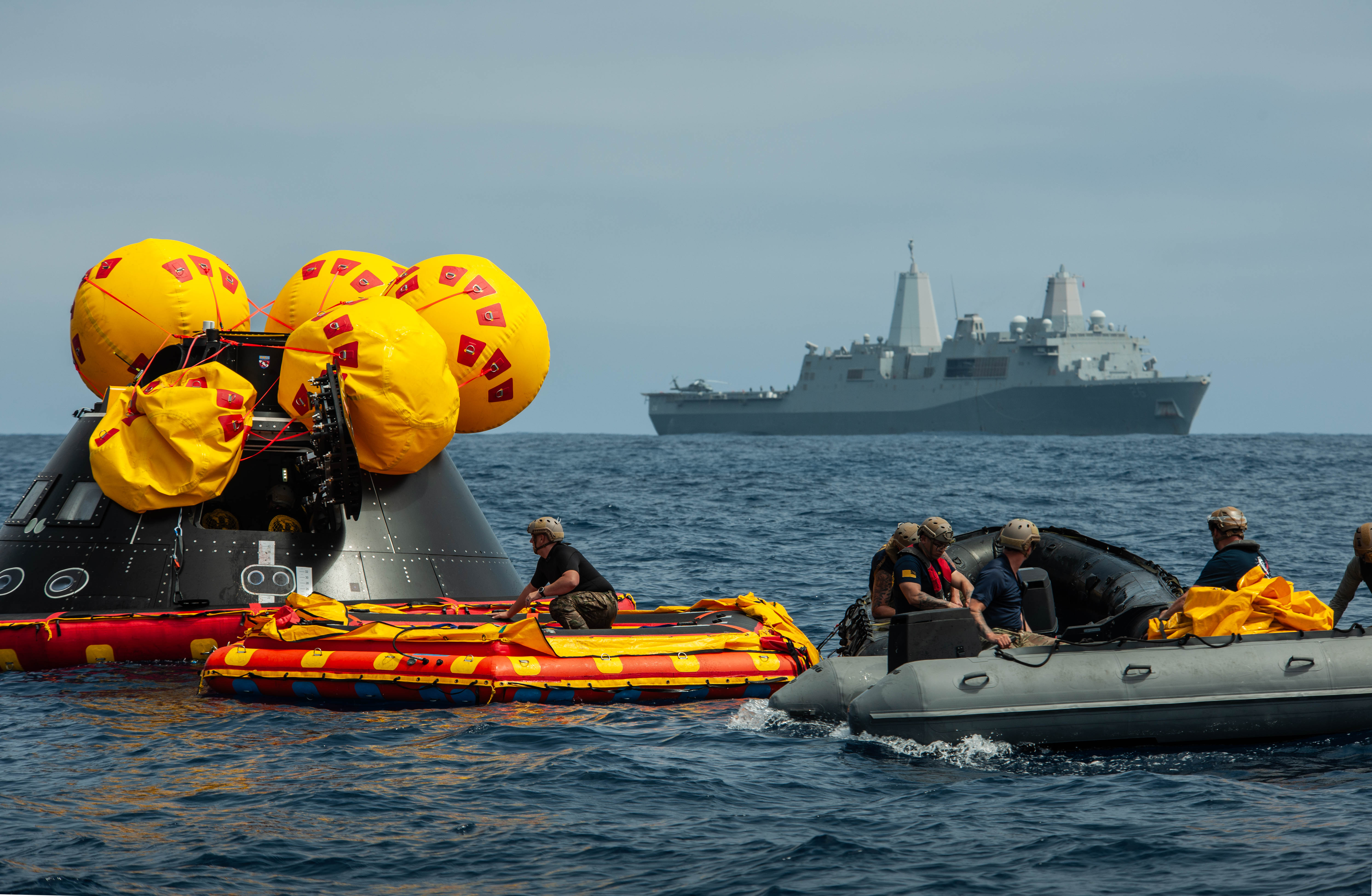 Navy divers from Explosive Ordnance Disposal (EOD) Expeditionary Support Unit 1 work to secure the Orion Crew Module Test Article (CMTA) in the Pacific Ocean as part of NASA’s Underway Recovery Test 10 (URT-10). The divers are trained in open water and small boat procedures and will be the team to help Artemis astronauts exit the Orion spacecraft and make it safely to the recovery ship after splashdown in addition to preparing the spacecraft to be transported back inside the recovery ship.