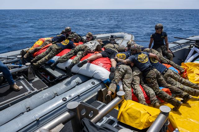Navy Divers from Explosive Ordnance Disposal (EOD) Expeditionary Support Unit 1, sailors from USS John P Murtha and NASA Open Water Lead, Tim Goddard, work to deflate Artemis recovery equipment after a simulated Artemis recovery operation as part of NASA’s Underway Recovery Test 10. The team will use these inflatables as a platform for astronauts as they exit the Orion spacecraft after splashing down in the Pacific Ocean