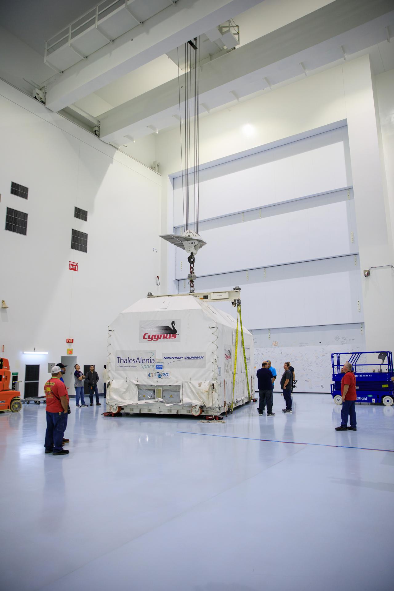 The Cygnus pressurized cargo module for Northrop Grumman’s 20th commercial resupply mission is lowered by crane in its carrier and secured onto a transport base inside the low bay in the Space Station Processing Facility at NASA's Kennedy Space Center in Florida on Aug. 2, 2023. Cygnus will launch later this year atop a SpaceX Falcon 9 rocket from Cape Canaveral Space Force Station’s Space Launch Complex 40 to the International Space Station. Cygnus will undergo prelaunch processing at Kennedy before it is transported to SpaceX’s integration facility.